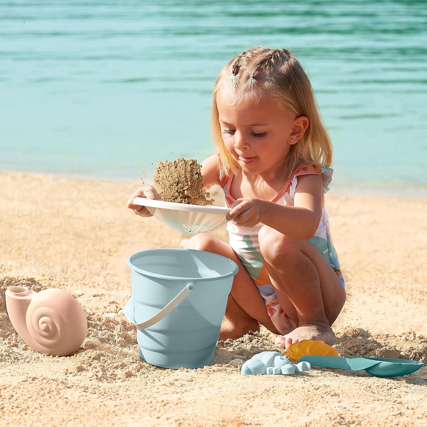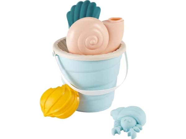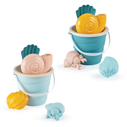 Deniz salyangozu şeklinde bir sulama kabı, bir elek, 2 kum kalıbı ve deniz kabuğu şeklinde bir kürek içeren Ecoiffier deniz kovası seti, oyun alanında, sahilde veya evdeki kum havuzunda saatlerce eğlence sunar.