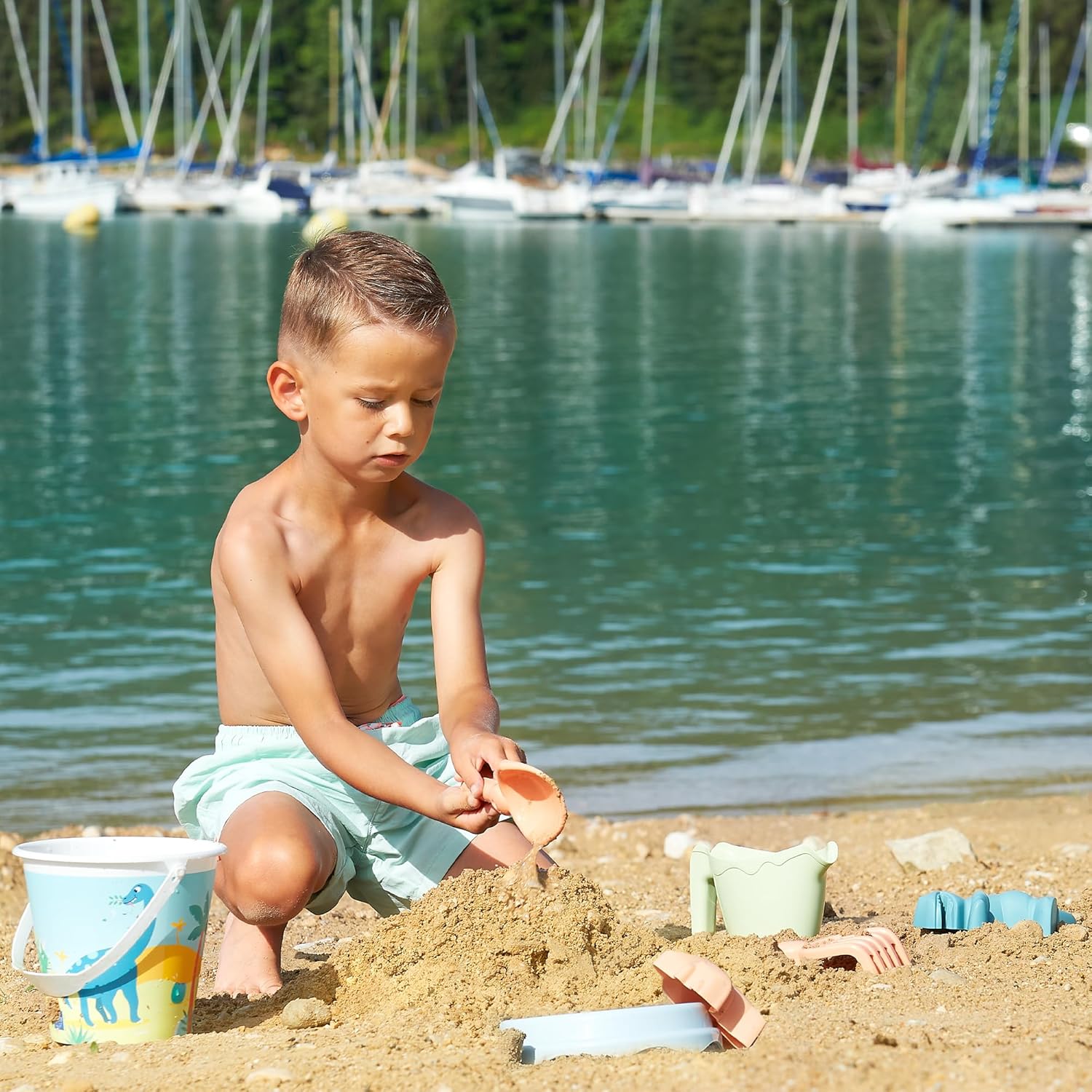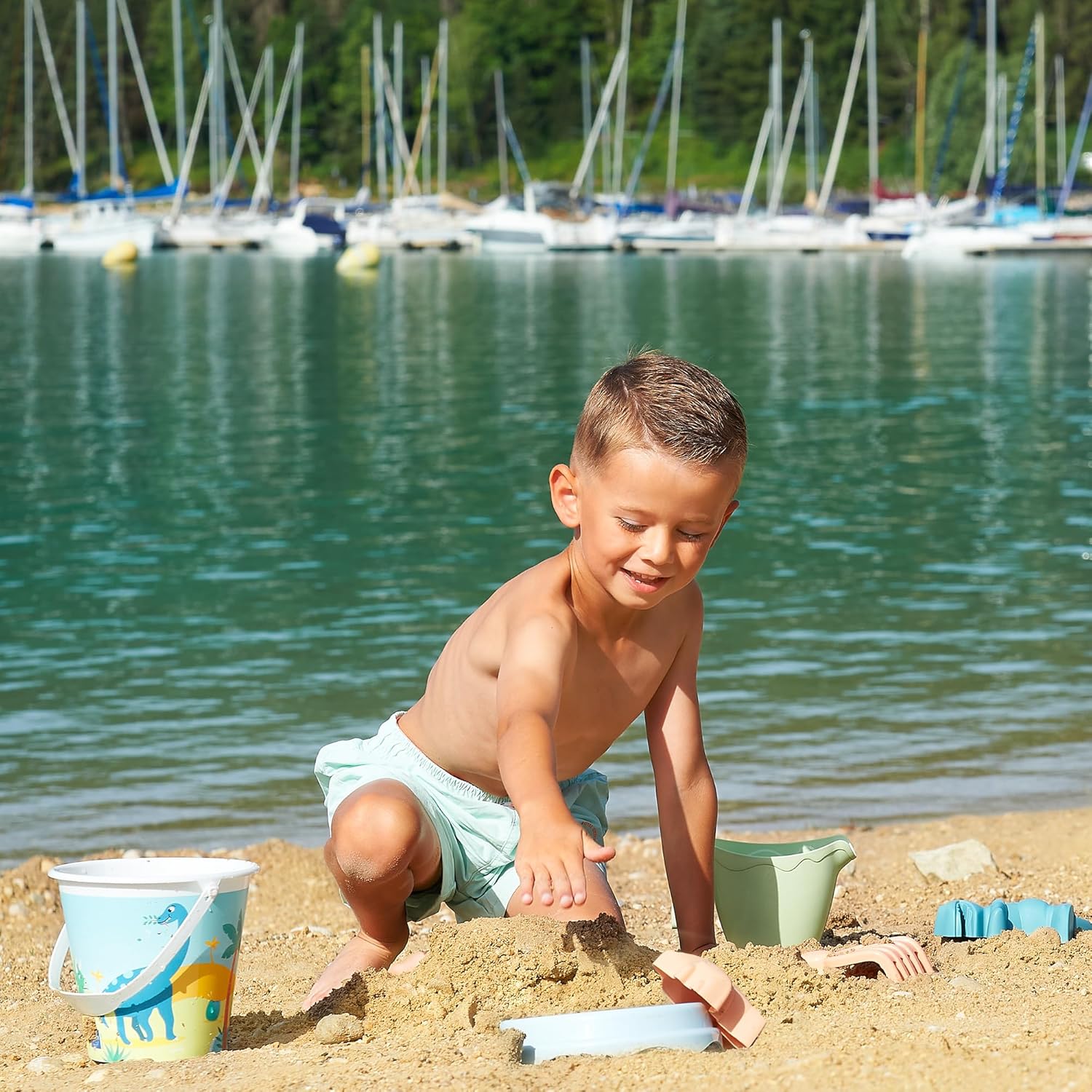 Bu 18 cm'lik dinozor temalı plaj kovası, 1 kürek, 1 tırmık, 1 sulama kabı, 1 elek ve 2 kum kalıbı içerir.