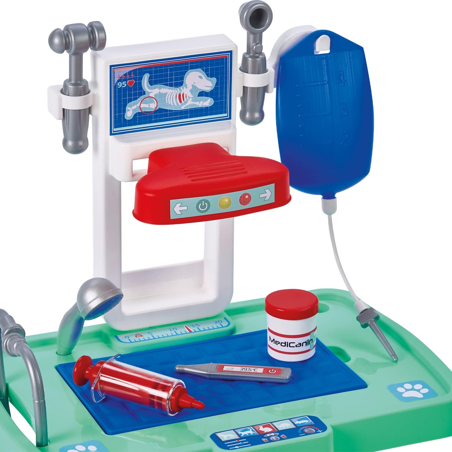 Bu sette 1 adet muayene masası, 1 adet peluş köpek ve taşıma