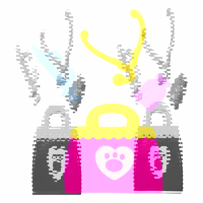 Muayene masası, çocukların ekipmanla doldurabileceği bir tıbbi çanta, bir
