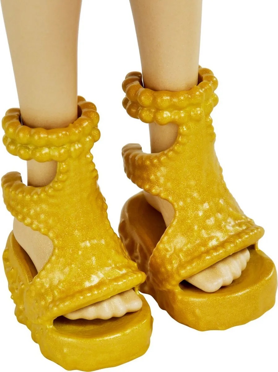 Oldie'nin güzel turkuaz saçları, mercan ve kabuklardan oluşan kırmızı bir tacı, açık bir üst kısmı ve kabukları ve mercanları olan bir deniz ağı şeklinde bir