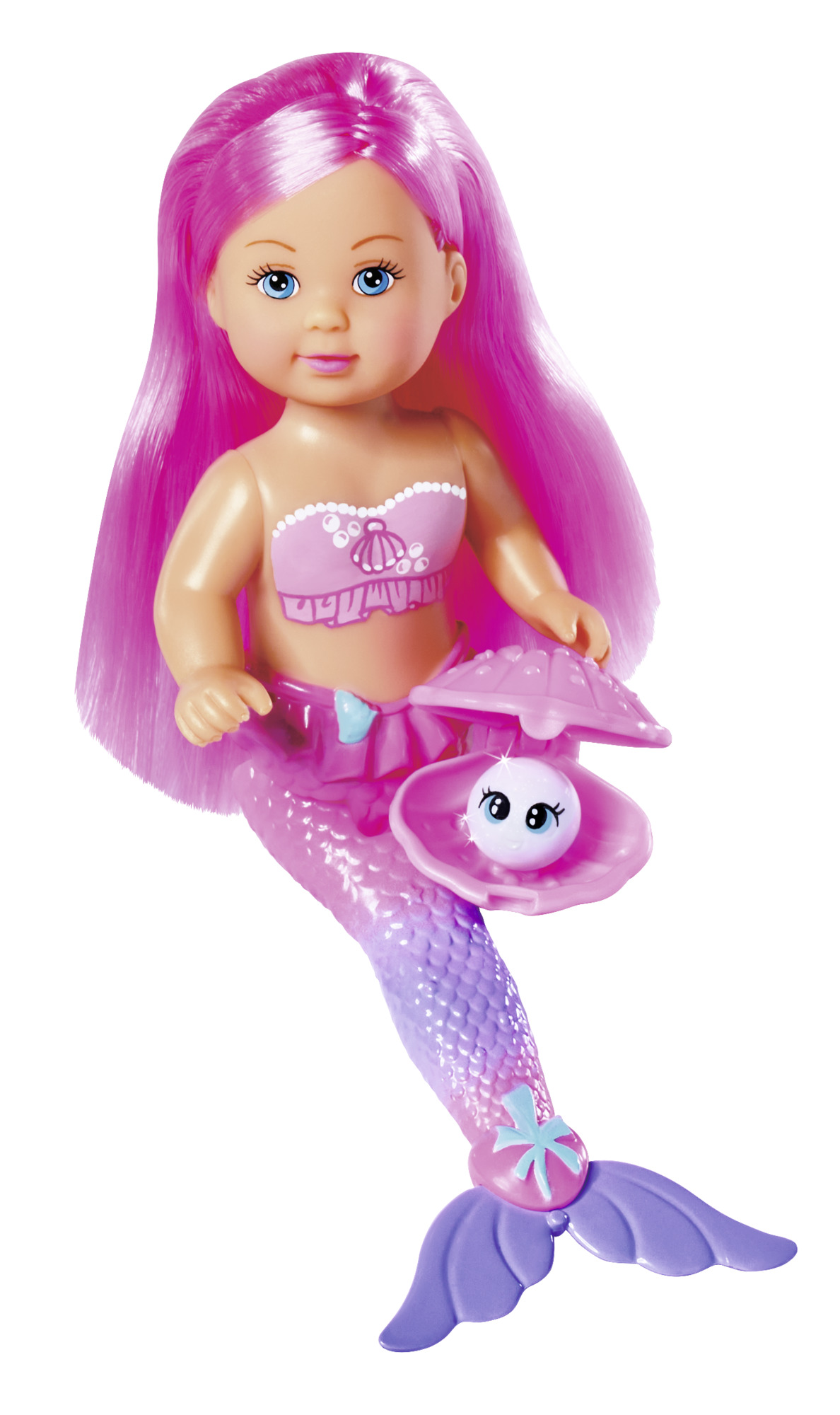 Evi Love Denizkızı bebeğinin uzun, pembe saçları ve renkli bir