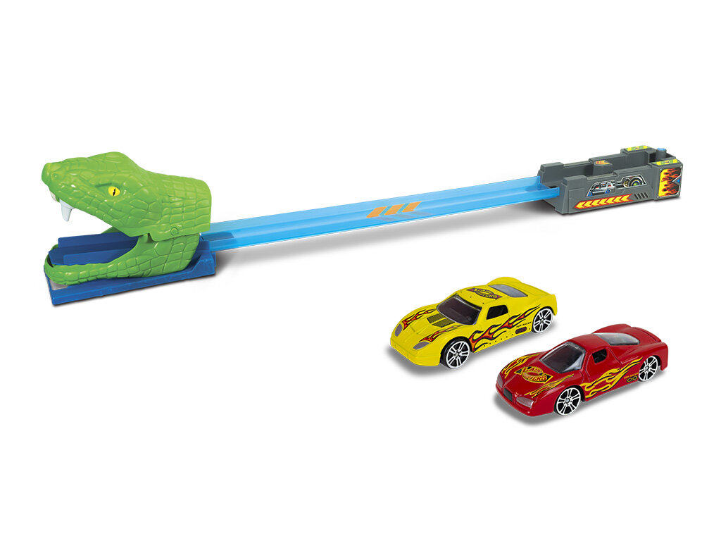 Snake Launch fırlatma hız yarışçıları pist seti, yarışçıların inanılmaz bir hızla ağızlarından koşmalarını sağlayan güçlü bir fırlatıcıyla birlikte geliyor.