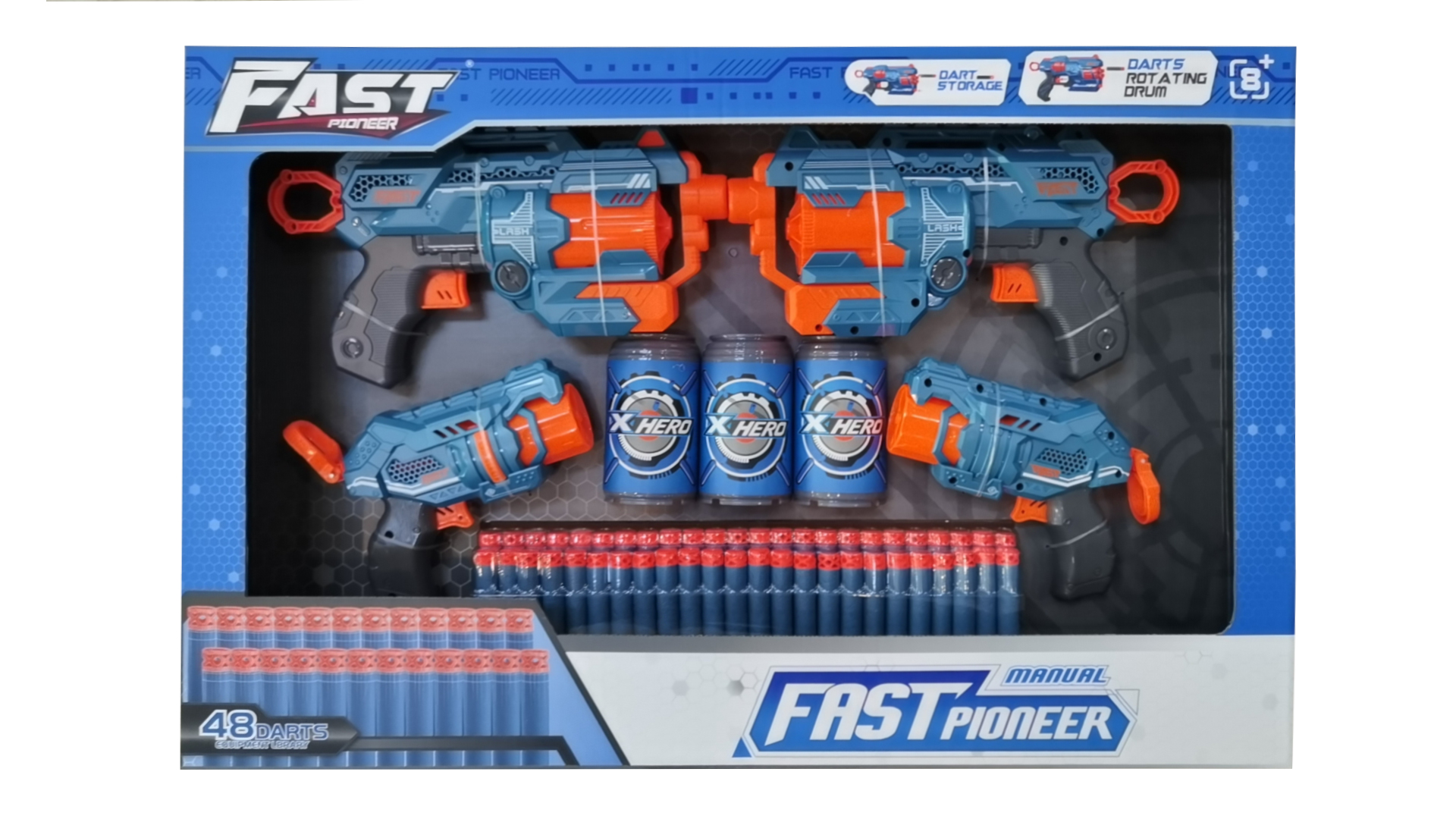 Bu set içerisinde 4 adet manuel oyuncak dart tabancası bulunmaktadır ve 48 adet yumuşak, güvenli dart ile eğlenceli oyunlar sunar.