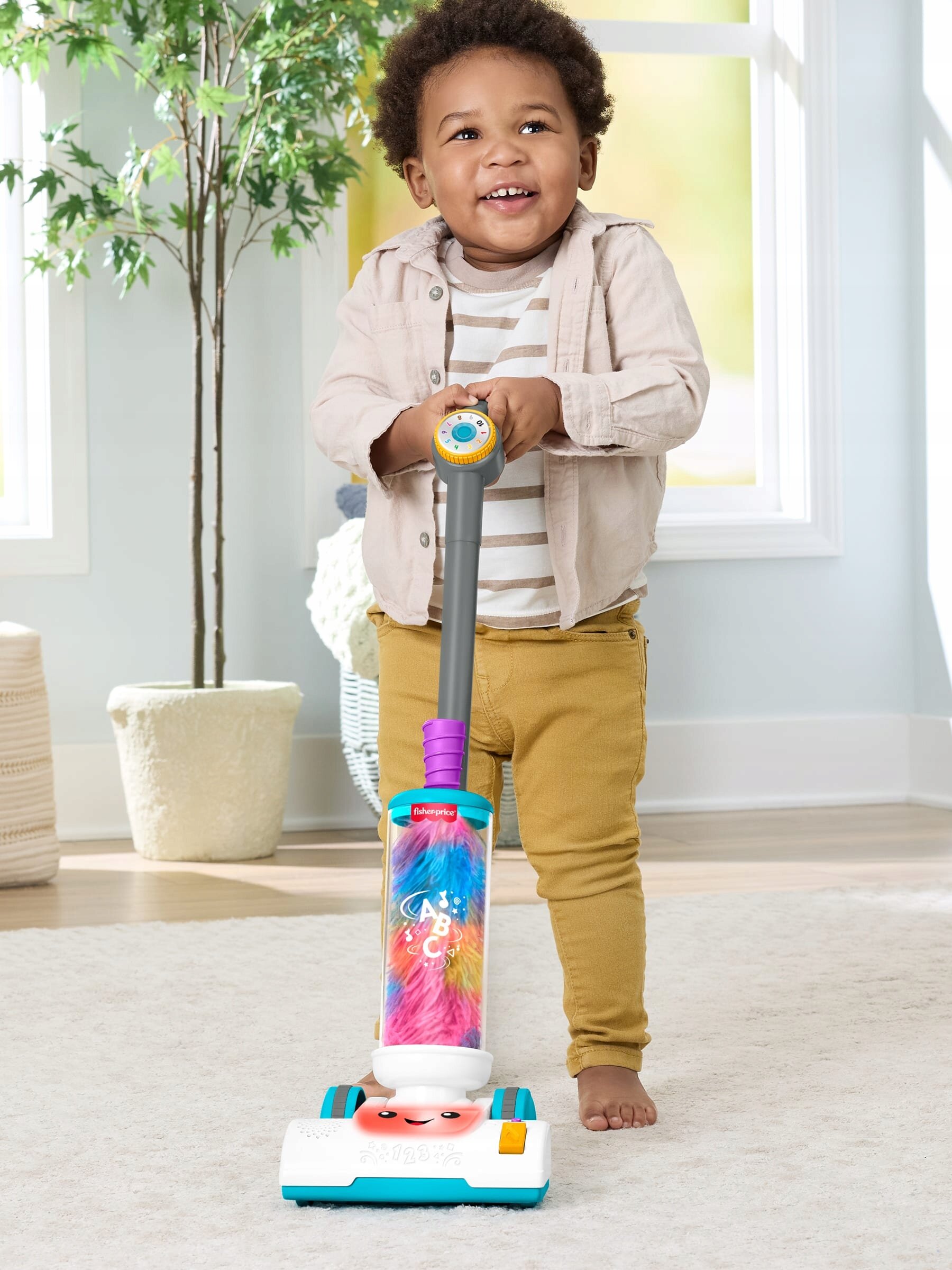 Fisher-Price Eğlen ve Öğren 2'si 1 Arada Süpürge elektronik oyuncak, yürüme çağındaki çocuklara 2'si 1 arada öğrenme eğlencesi sunar.