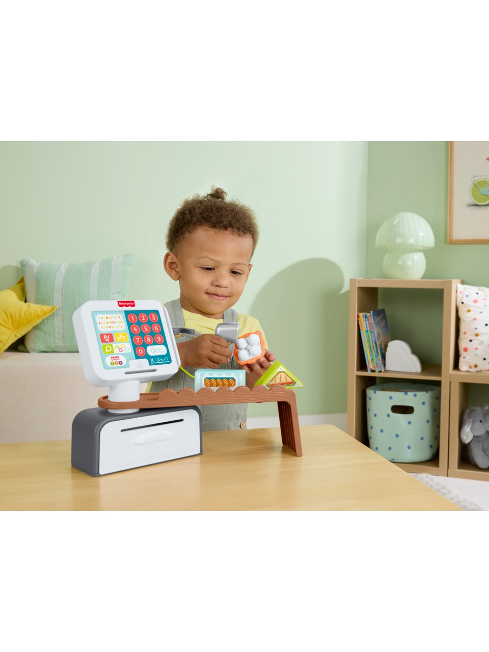 Elektronik ve eğitici Fisher-Price Eğlen ve Öğren Market Kasası oyuncak kasa, yürüme çağındaki ve okul öncesi çağdaki çocuklara sayıları, saymayı, alfabeyi, renkleri, şekilleri ve daha fazlasını öğretir.