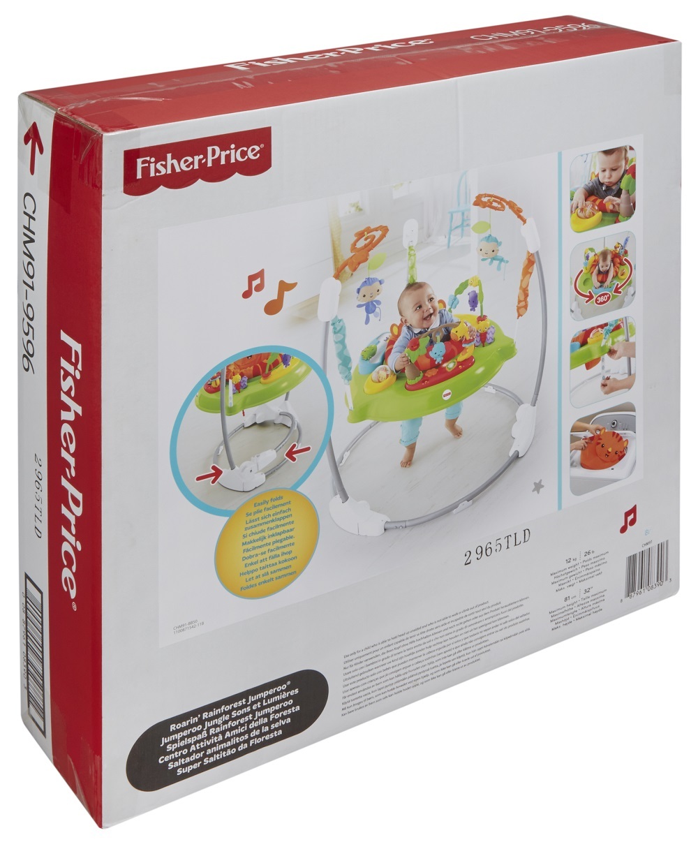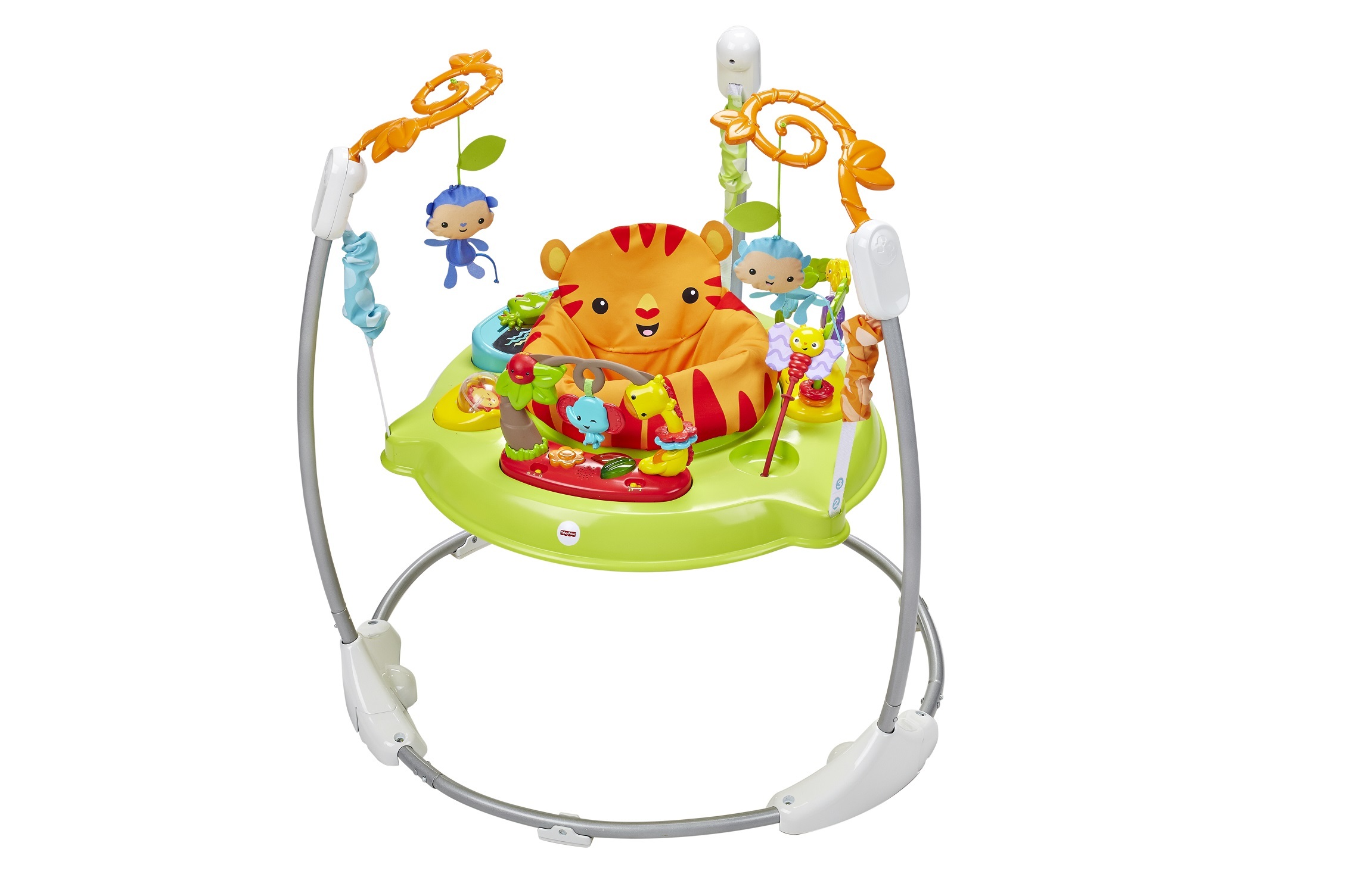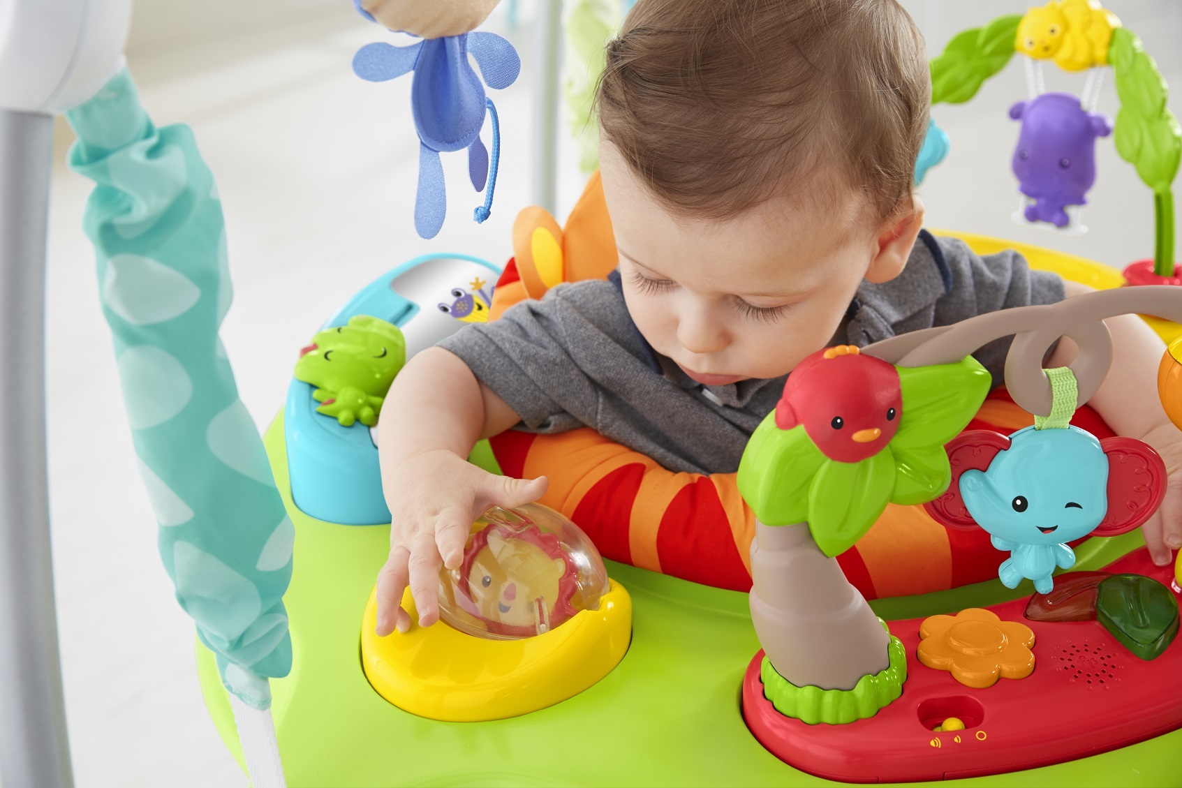 Jumperoo üzerinde birbirinden eğlenceli birçok oyuncak bulunur; aslanlı top, timsah çıngırak, kelebek dişlik, eğlenceli fil ve hipopotam ve çok daha fazlası.