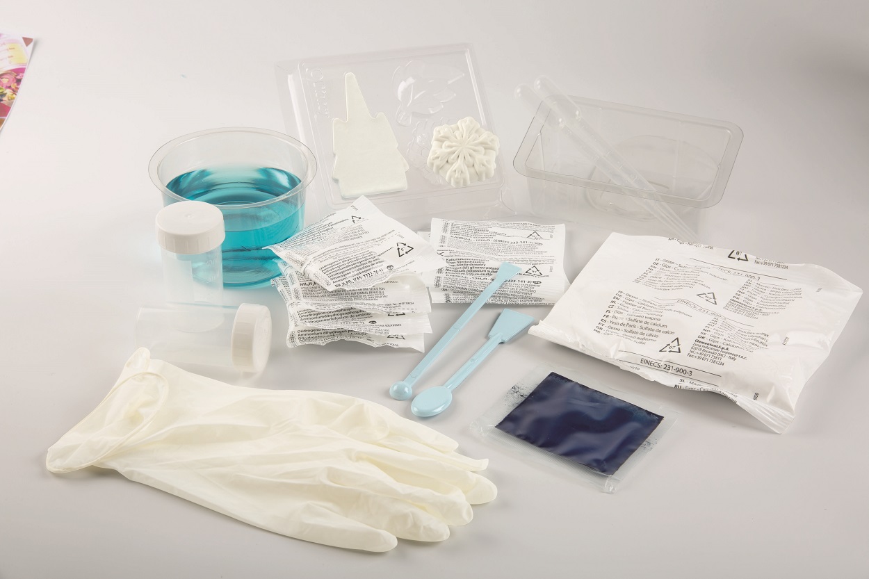 eldiven, 50ml. kapaklı deney kapları, yuvarlak kap, dikdörtgen kap, spatula, ölçülü kaşık, pipetler, şekiller için kalıp ve resimli kullanım kılavuzu yer almaktadır.