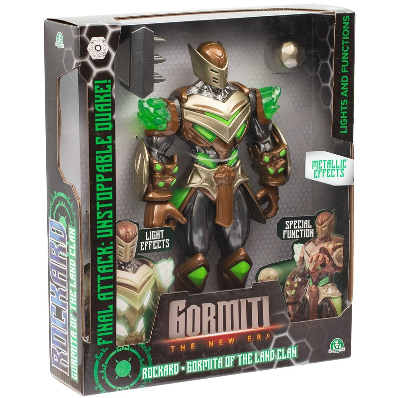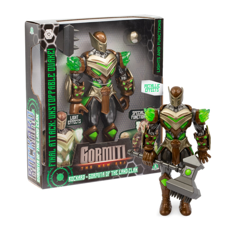 Rockard, Gormiti of Earth: çekiç ve kaya topuyla – kaya topu fırlatıcısını devreye sokmak için elini kaldır ve ışıklarını yakmak için göğüsteki düğmeye bas.