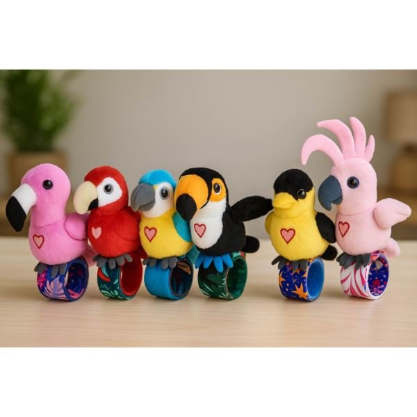 Ses taklit eden interaktif peluş papağan ve slap bant ile bileğe takılabilir tasarım.