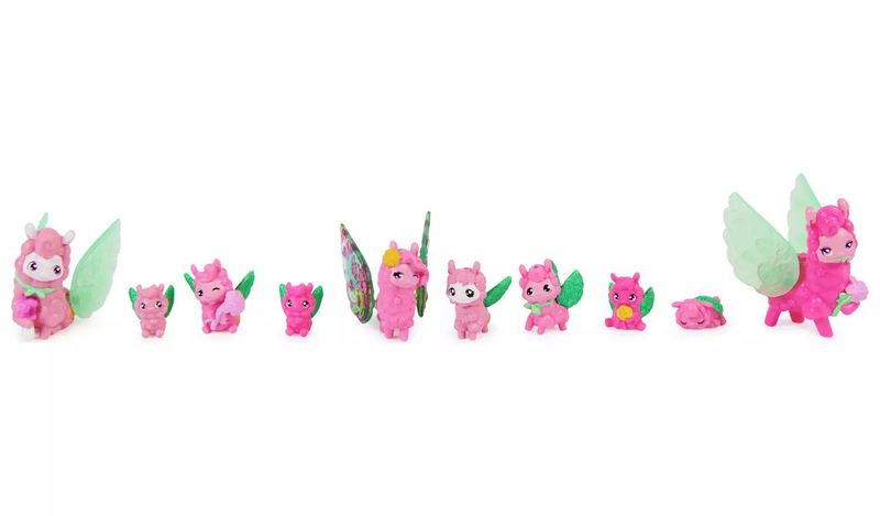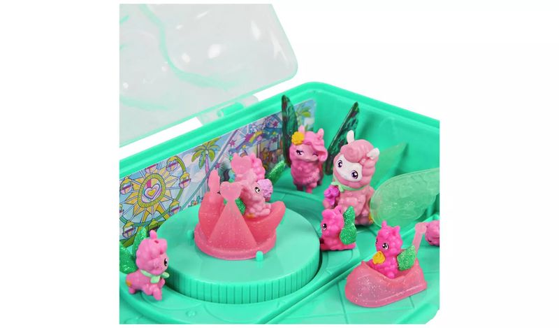 Rainbow-katyonunda 10 lama karakteri, iki oyun aksesuarı ve içinde gizli bir tema parkı oyun seti.