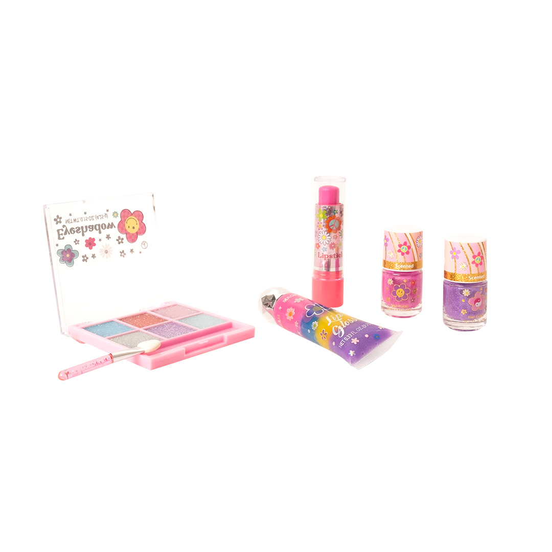 İçeriği: 1 adet akrilik çanta, 1 Dudak parlatıcısı, 1 Ruj, 1 parıltılı göz farı paleti, 2 Kokulu su bazlı oje, 1 Göz farı aplikatörü mevcuttur.