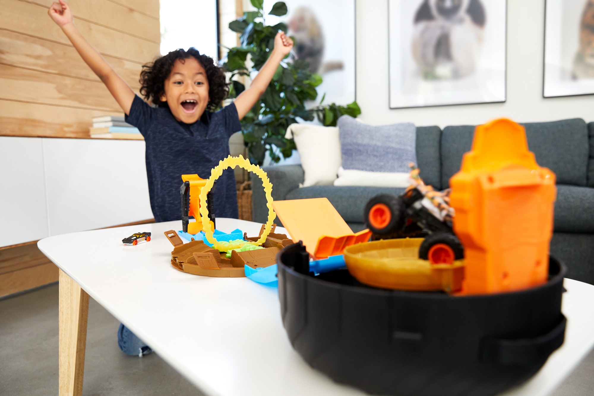 Hot Wheels Monster Trucks Akrobasi Tekerleği, kolay taşınabilirlik için bir tutacakla katlanır ve açılır, çarpma, parçalama ve saklama için üst düzey bir akrobasi