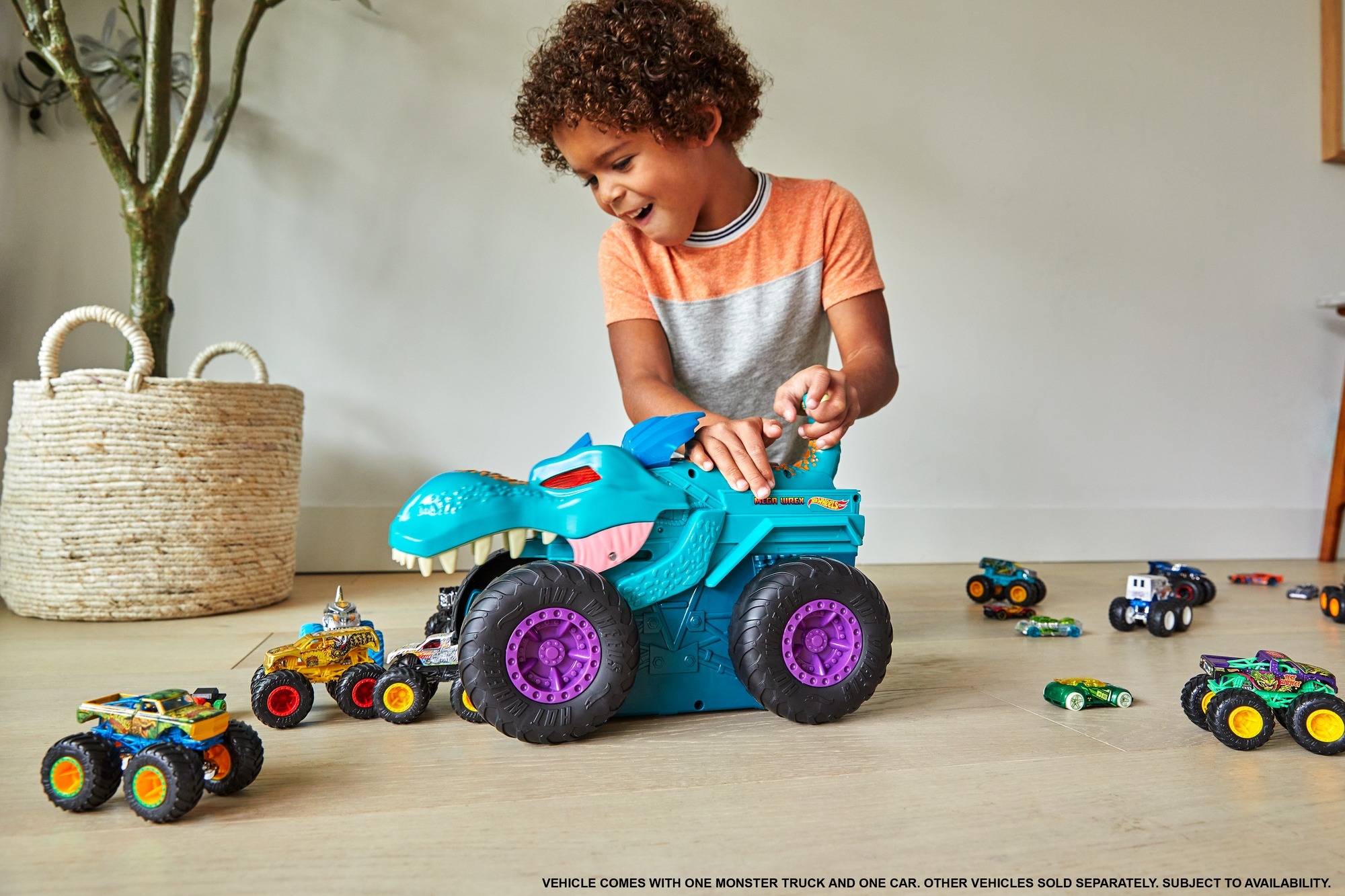 Mega Wrex'i kuyruğundan iterek 1:64 ölçekli metal arabalar ve Hot Wheels® Monster Trucks araçlarını yutun.