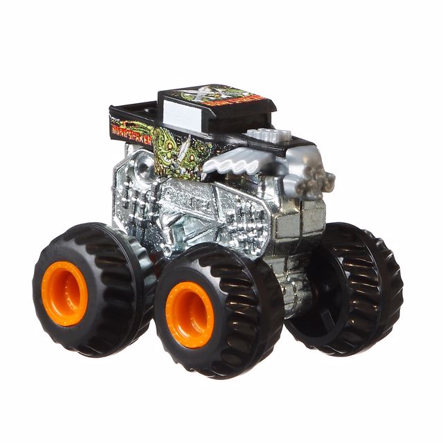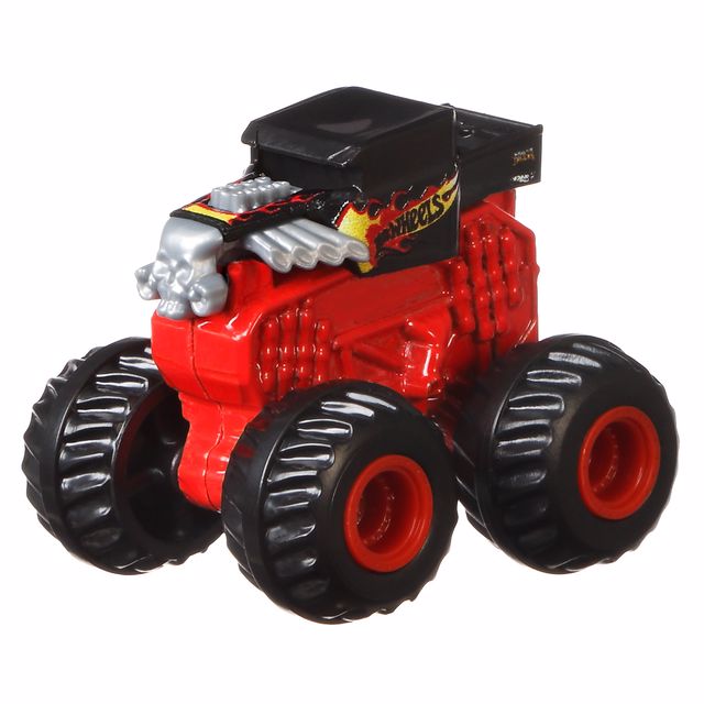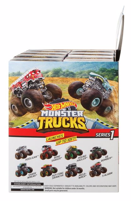 Her kutuda 1 adet mini Hot Wheels Monster Truck, bir