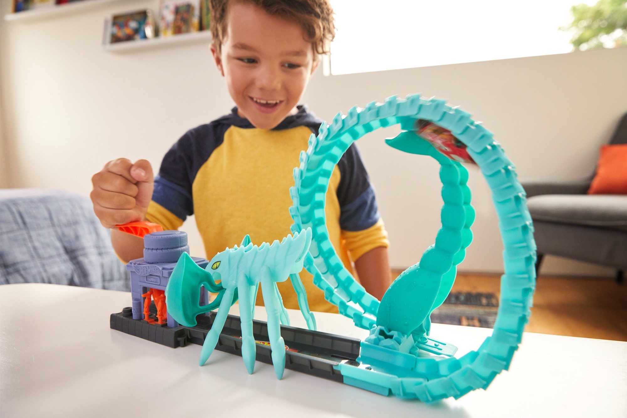 Heyecan verici her bir set çocukların kahraman rolünü oynayabileceği ve Hot Wheels arabalarını kullanarak mücadele edip akrobatik hareketlerle günü