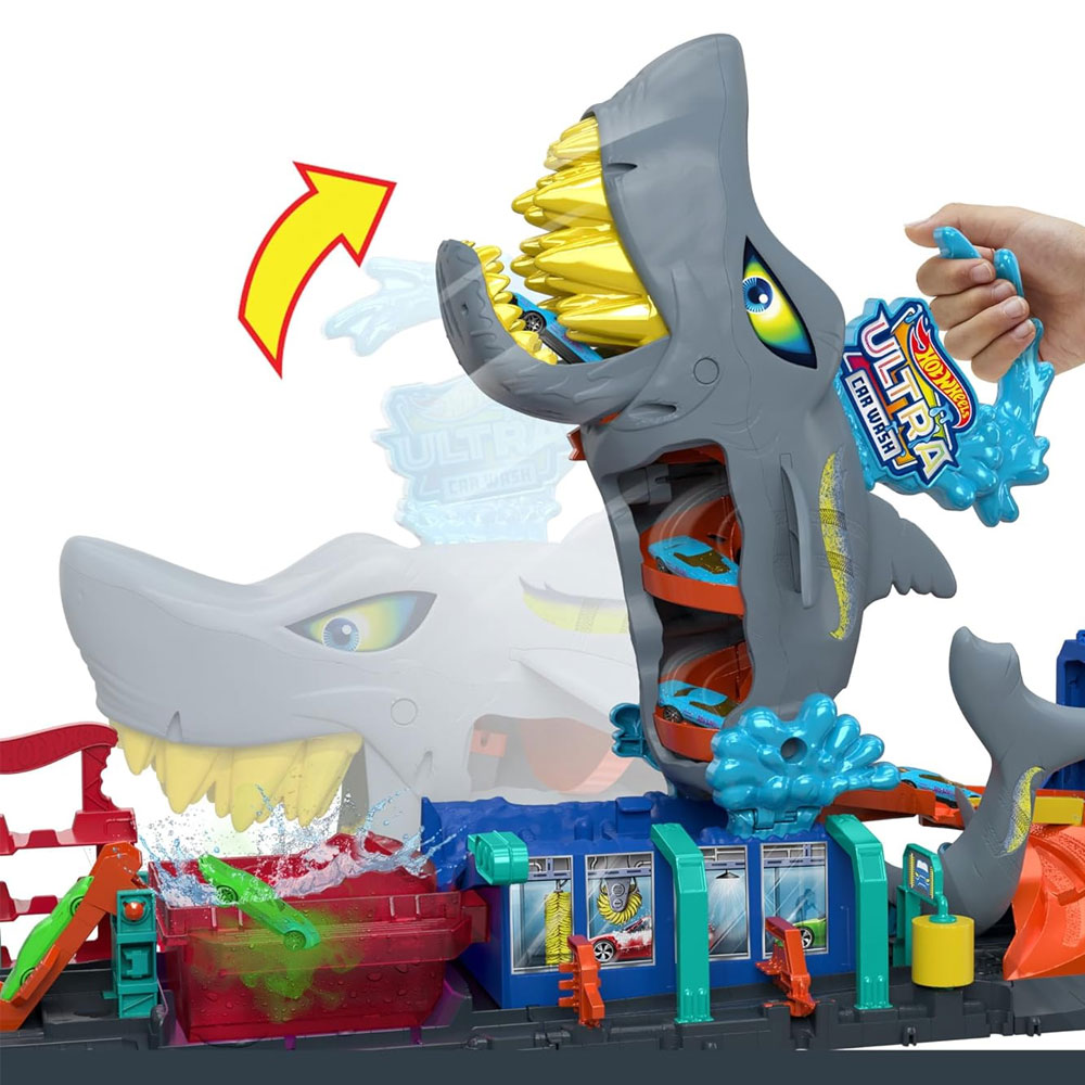 Hot Wheels Şehri Muhteşem Köpek Balığı Araba Yıkama ile 'Let's Race!' adlı Netflix serisinde gösterilen yerde renk değişimi ile etkileşimli bir maceraya atılın. Araba yıkama temalı oyun seti, araba yıkama makinesi ve hareketli kapılar gibi gerçekçi araba yıkama ayrıntılarıyla farklı hikayelere ilham verir. Çocuklar, köpek balığının ağzına doğru gidip ilk sürprizi görmek için köpek balığının başına dokunur. Özel renk değiştiren boya akarken suyun rengi değişir ve arabanın etkileyici süslemeleri ortaya çıkar. 1:64 ölçekte renk değiştiren oyuncak araba sete dahildir.