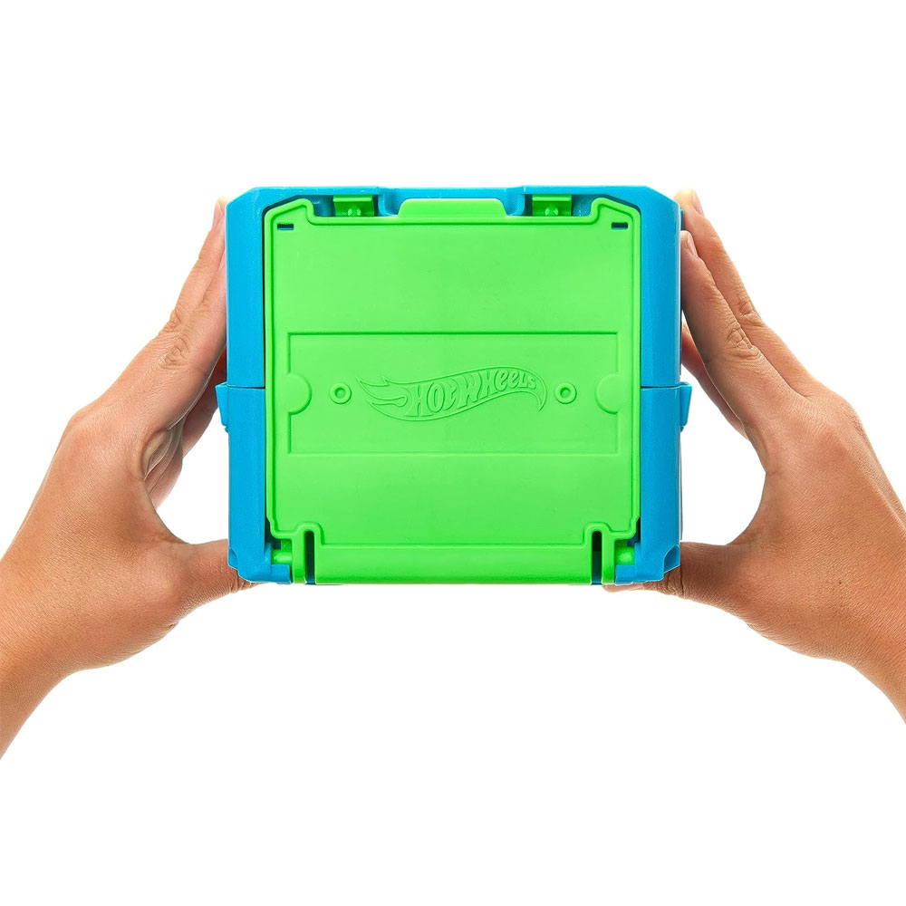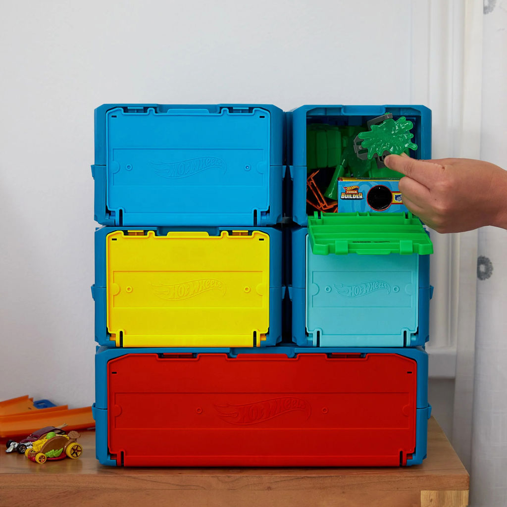 Tüm parçalar, palet konfigürasyonlarında ve diğer Hot Wheels Track Builder kutularının üzerine istiflenebilen yenilikçi modüler saklama kutusuna sığar.