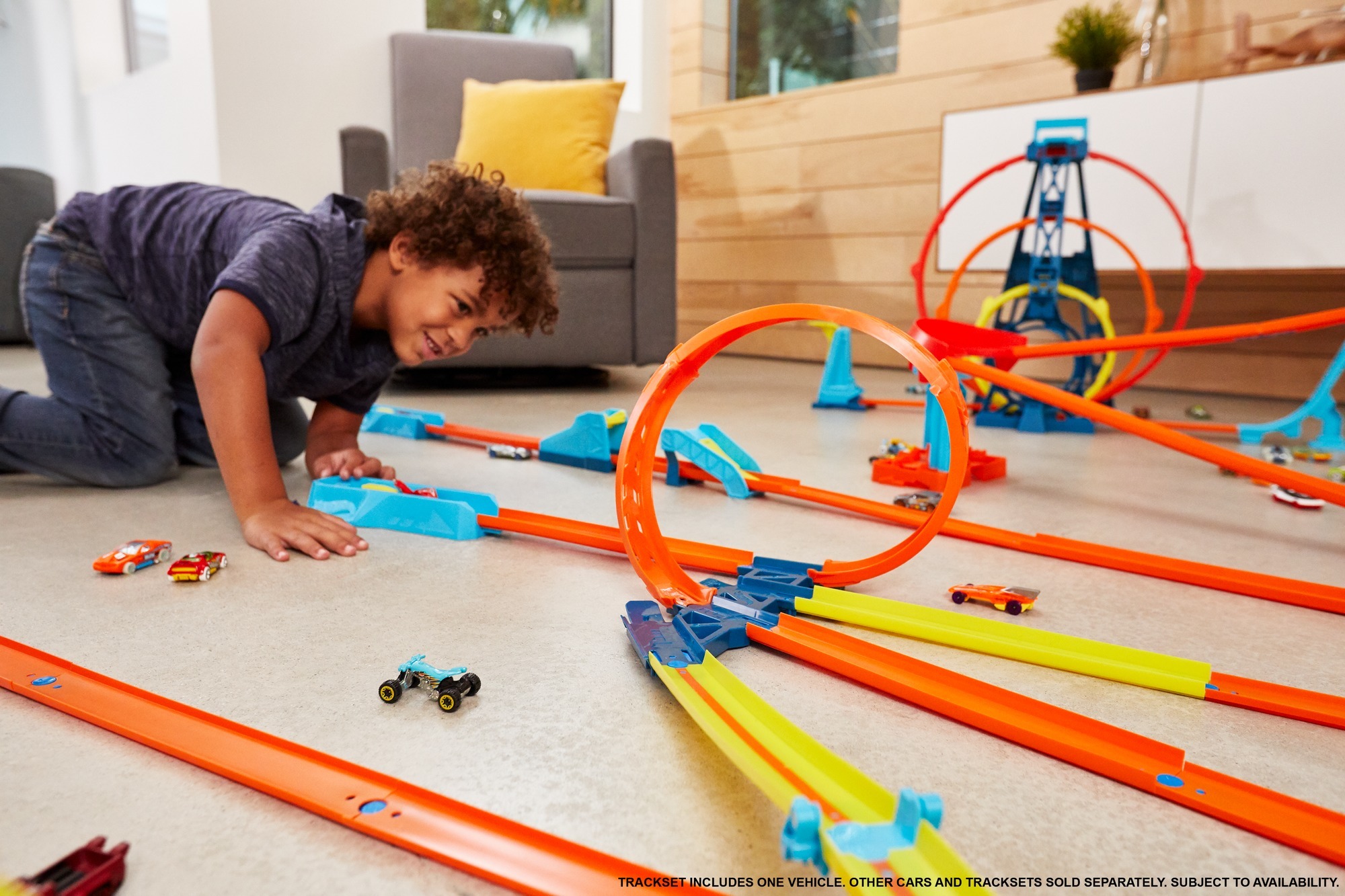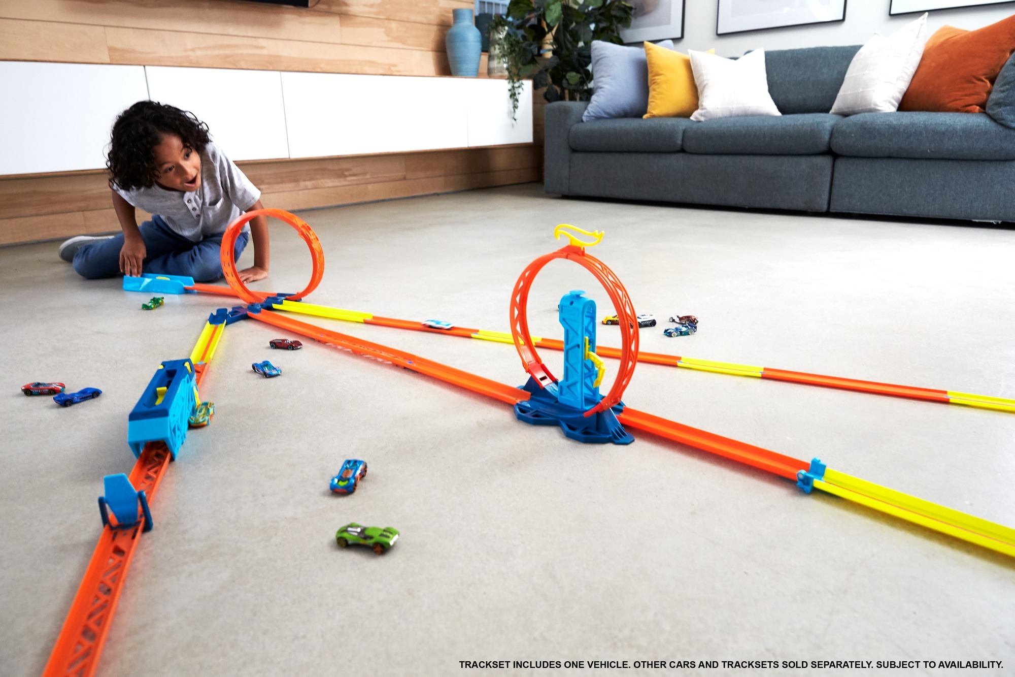 Spiral çember, diğer Track Builder setlerine (Ayrı olarak satılır.) bağlanabilen ve akrobasiyi çeşitlendiren üç benzersiz çıkış pistine bağlanır.