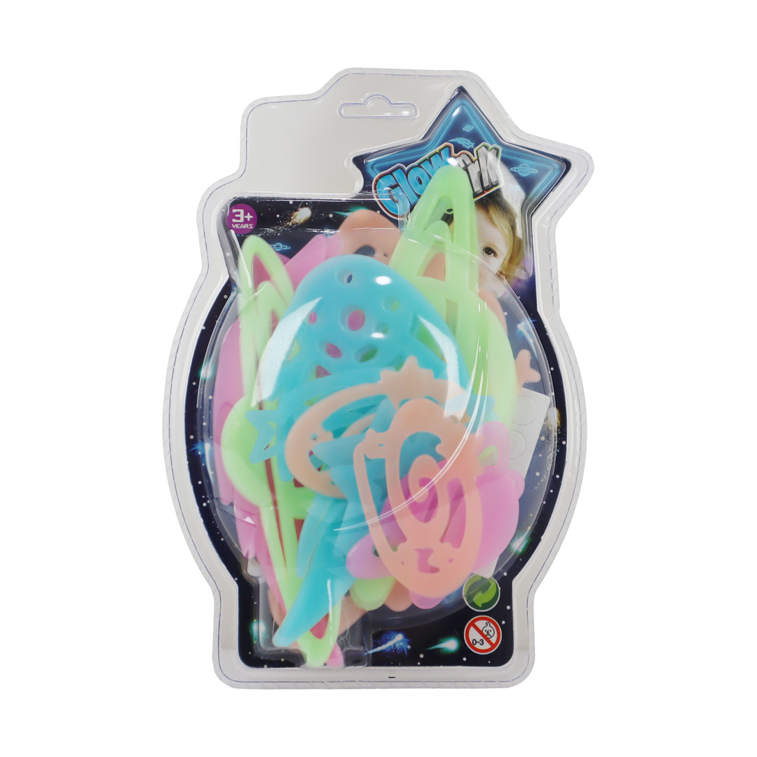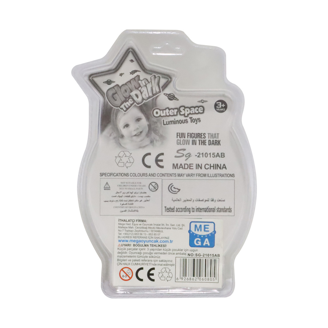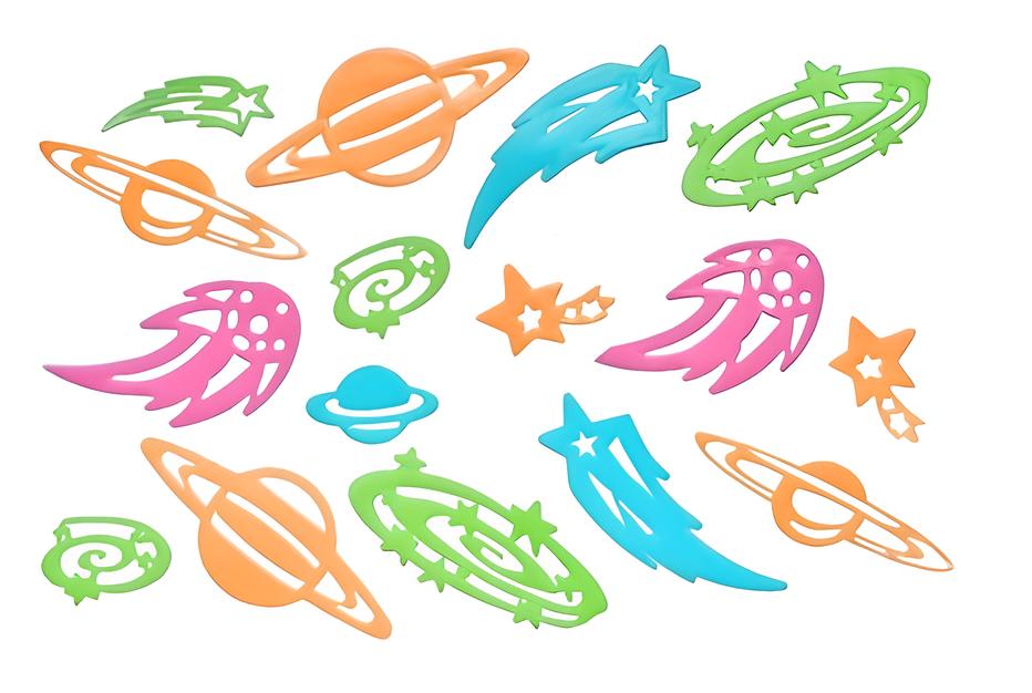 Güneşten veya yapay ışıktan yayılan ışığı emerek karanlıkta parlayan 18 floresan çıkartmadan oluşan bir set.