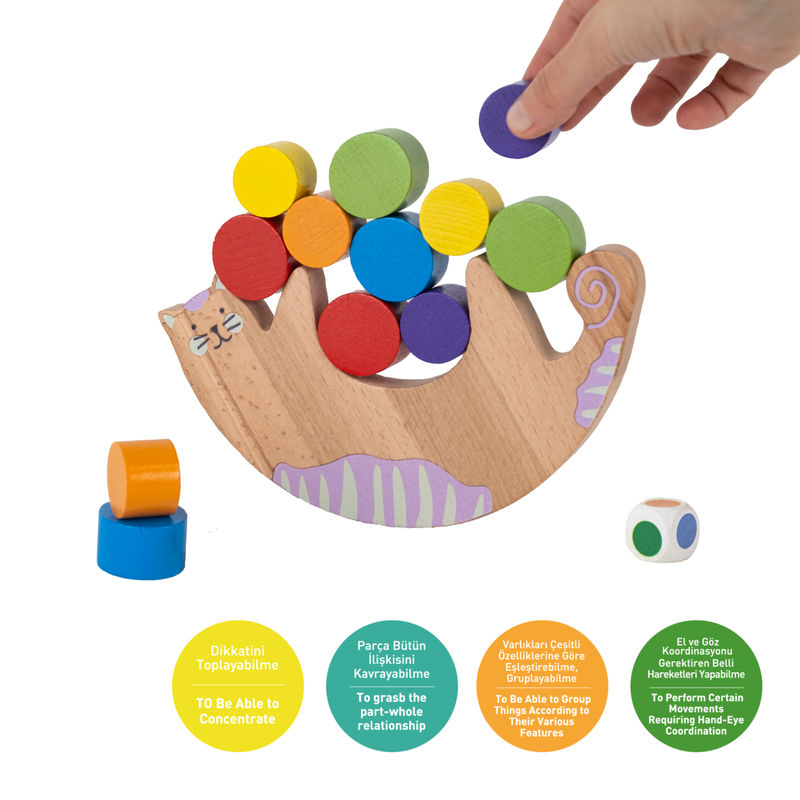 yerleştirilir. Amaç, kedi figürünü devirmeden silindirleri dengeli şekilde