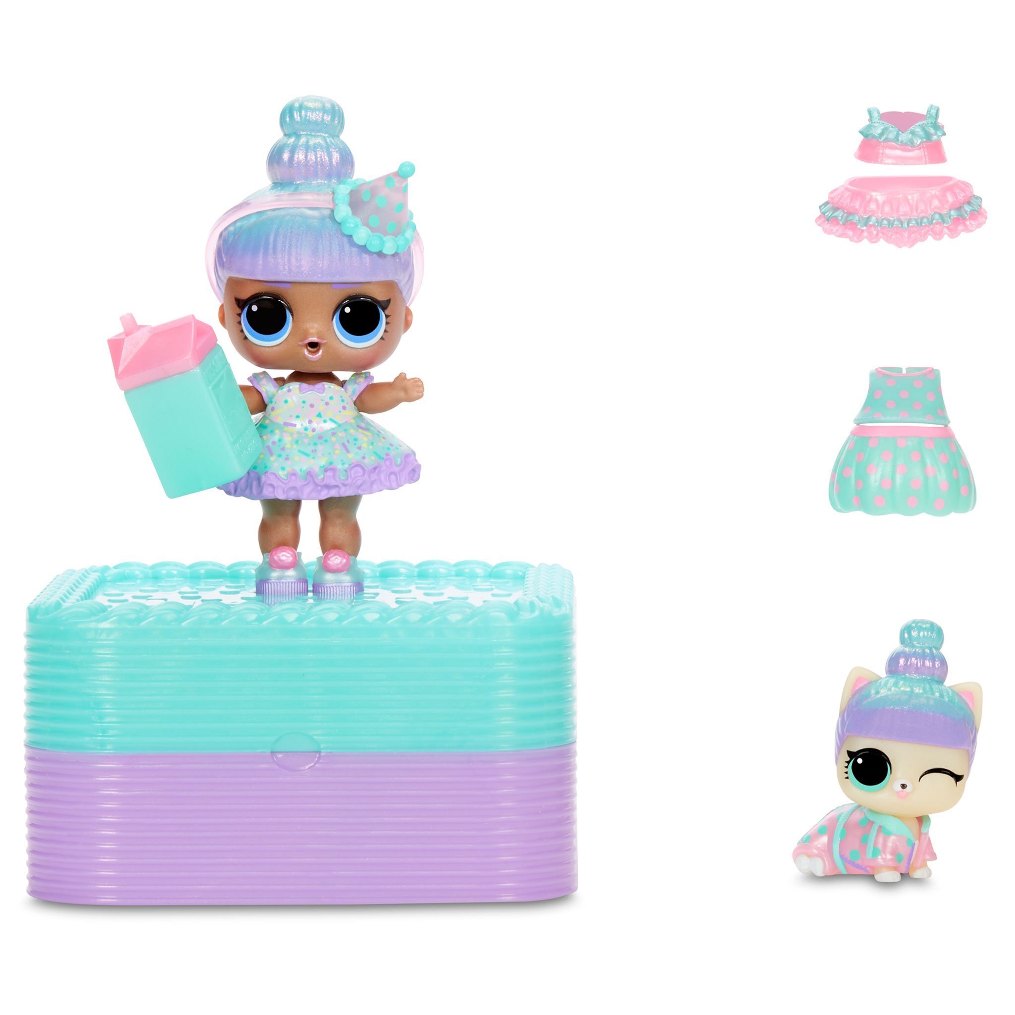 Kek şeklindeki süpriz paket içerisinde 1 Çok Özel L.O.L. Bebek,1 çok özel Pets ve 1 Şişe mevcut.