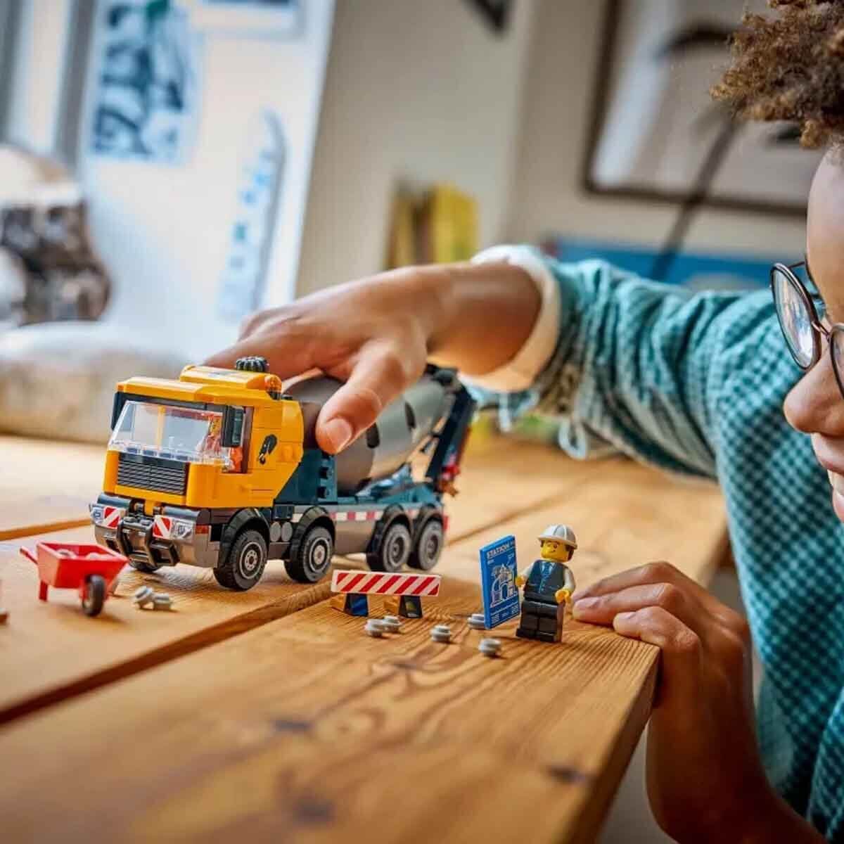 Ayrıntılarla dolu, 8 lastik tekerlekli beton mikser kamyonu, Arşimet vidası sistemli büyük bir tambura sahiptir. Çocuklar, kadranı çevirip LEGO çimentosunu karıştırarak ayarlanabilir döküm sayesinde aşağıya gerçek çimento gibi dökebilir.