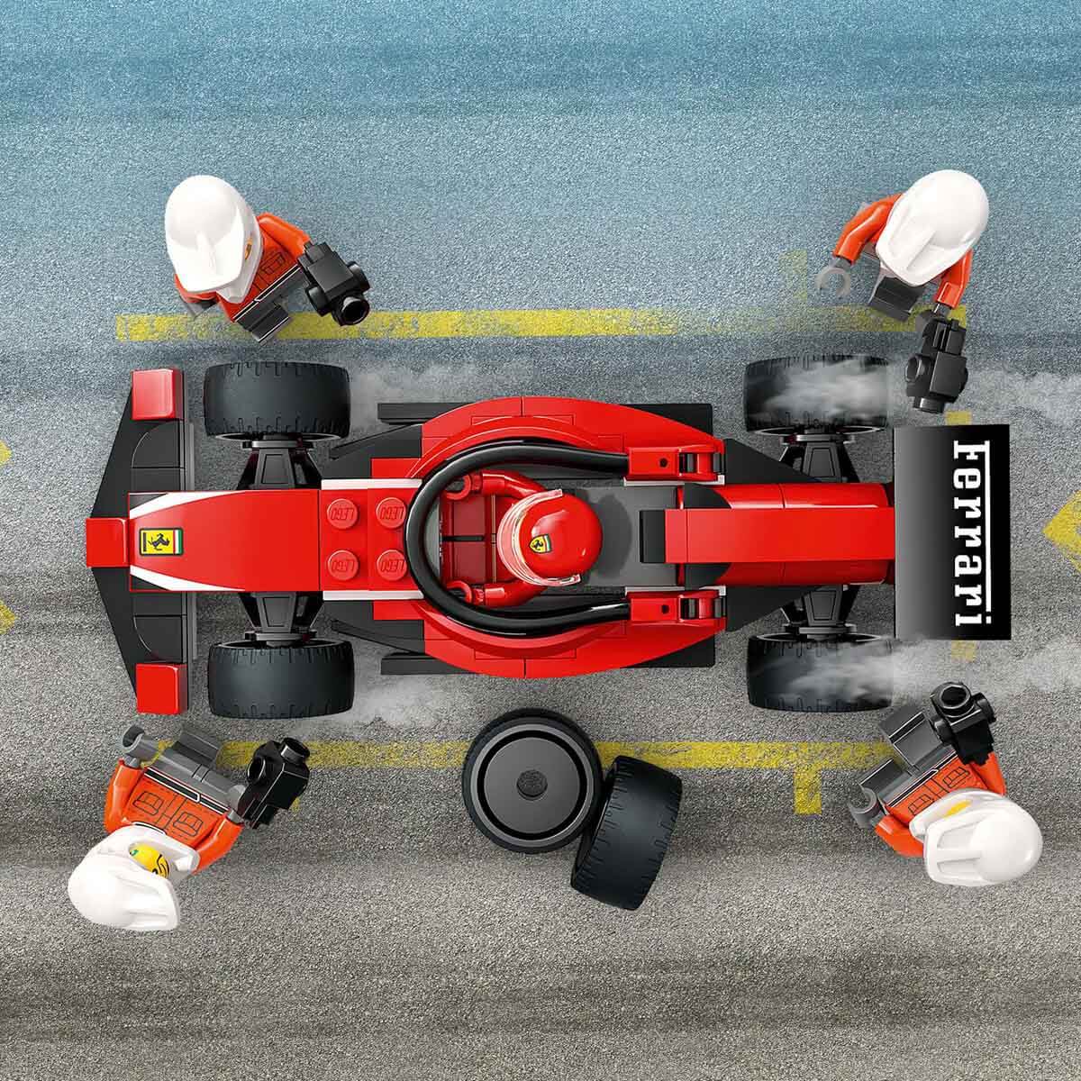 Oyuncak bir Formula 1 Ferrari yarış arabası, sürücü ve 4 pit ekibi mini figürü içeren bu oyun seti, genç yarış tutkunlarına göre tasarlanmıştır.