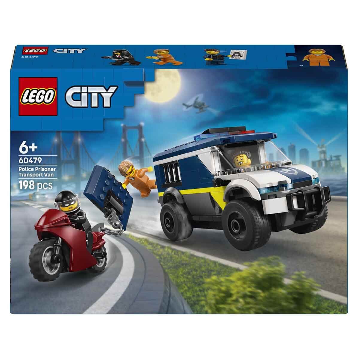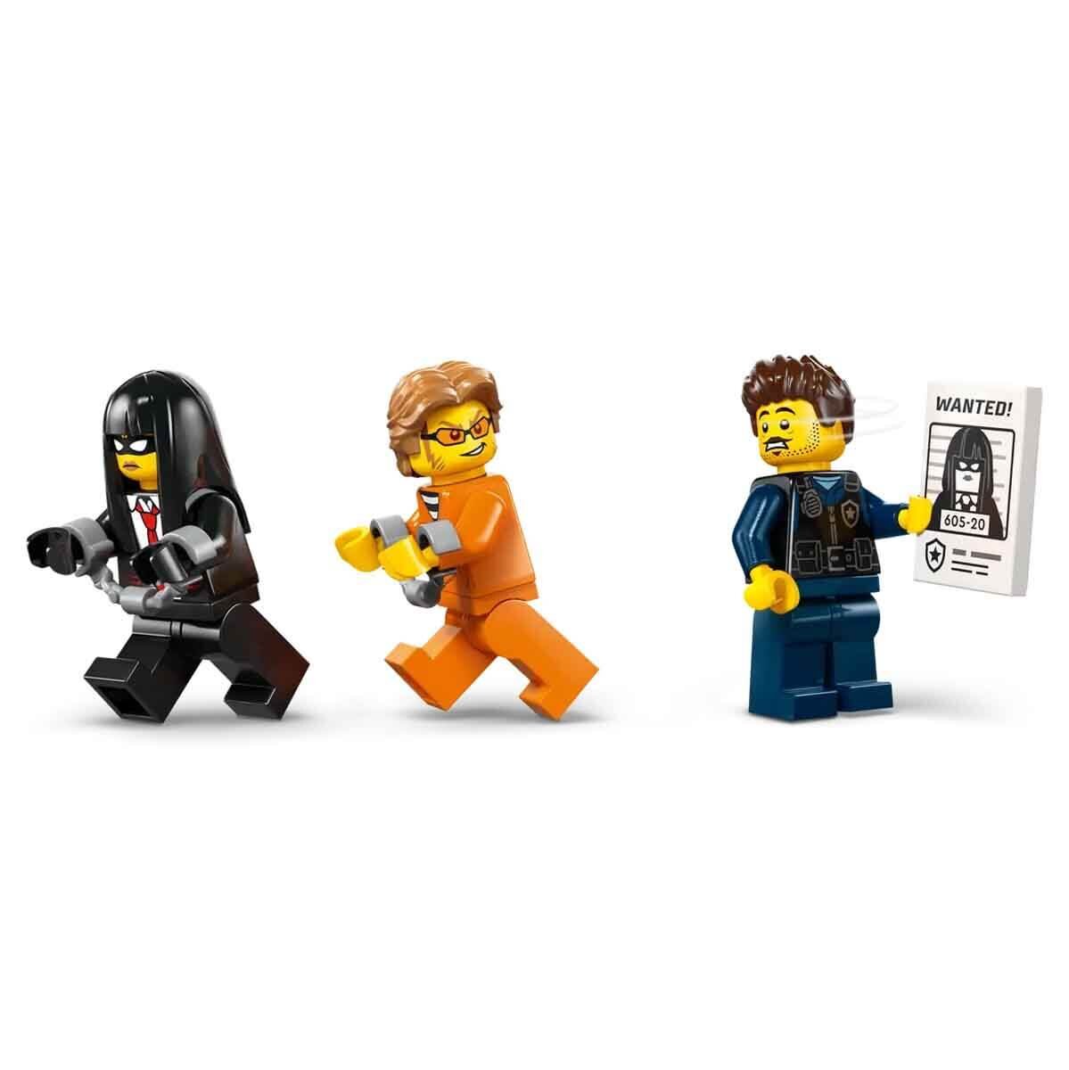 Polis kamyonu modelinde ayrıntılı bir sürücü kabini ve 2 haydutun sığabileceği hapishane hücresi bulunur. Çocuklar, zinciri ve kancası olan oyuncak motosikleti kullanarak hücre kapısını çekebilir. Heyecanlı bir hapishane firar rol oyunu için polis memuru ve 2 haydut mini figürünü eklemeniz yeterli.