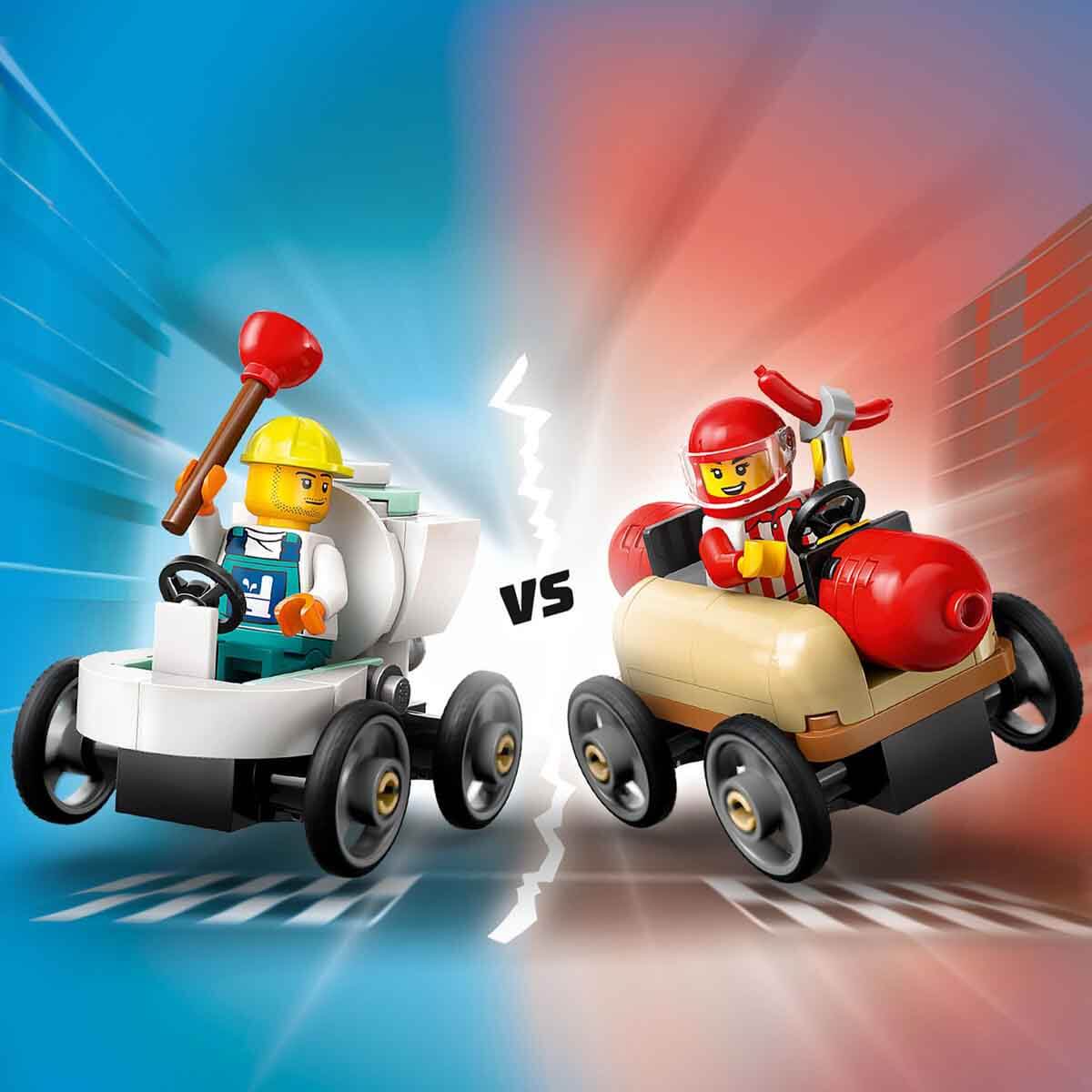 Çocukların oyuncak araba rampası, sosisli sandviç ve tuvalet soapbox arabaları, sosisli sandviç satıcısı ve tesisatçı sürücüler dahil 4 minifigür yapmak için ihtiyaçları olan her şey bulunur.