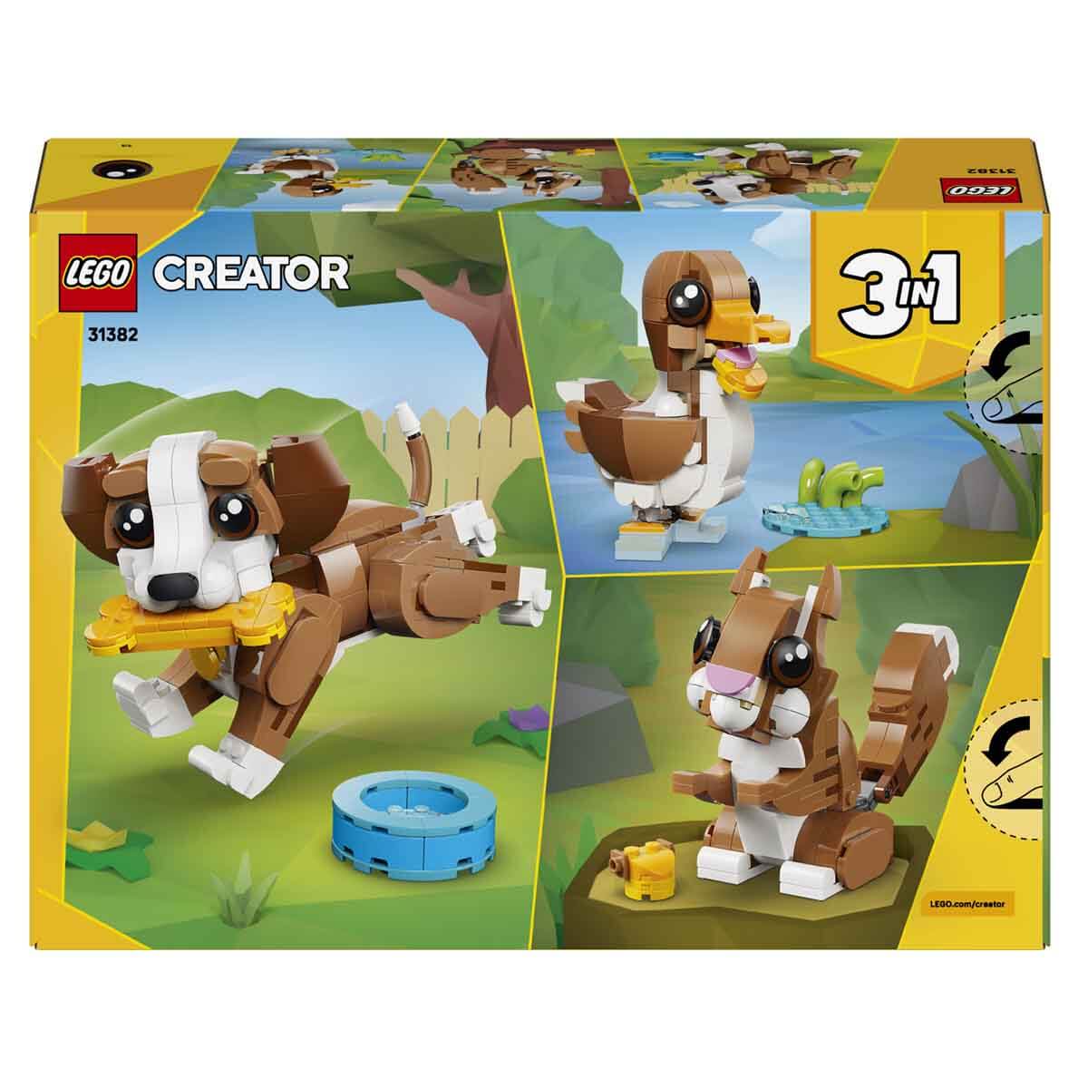 1 sette 3 sevimli LEGO hayvanı Eğlenceli Yavru Köpek (31382) yapım seti, 8 yaş ve üzeri çocukların eğlenceli hikayeler yaratmasını sağlar. Kız ve erkek çocuklara yönelik bu sevimli hayvan oyuncağı, aynı yapım parçalarıyla 3 farklı yapım seçeneği sunar.