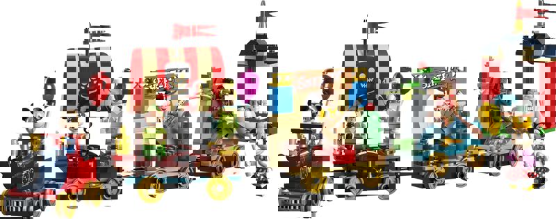 LEGO® Disney Kutlama Treni (43212) setinde bir istasyon, lokomotif, 3 tren arabası ve 6 LEGO minifigür bulunur: Mickey Fare, Minnie Fare, Moana, Peter Pan, Tinker Bell ve Woody.