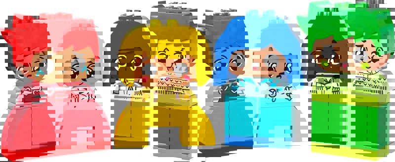 Renkli yapım parçalarını üst üste dizen küçük çocuklar, karakterlere aynı ya da zıt renkte peruk taktıktan sonra ifadeli yapım parçalarıyla LEGO® DUPLO® insanların duygularını seçer.