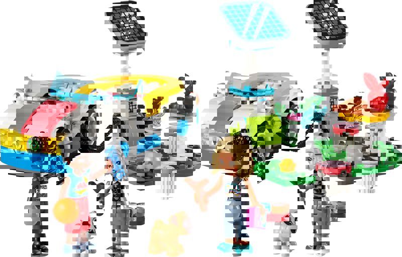 Bu araba yapım setinde oyuncak bir şarj istasyonu, 2 karakter, aksesuarlar ve bir köpek figürü bulunur.