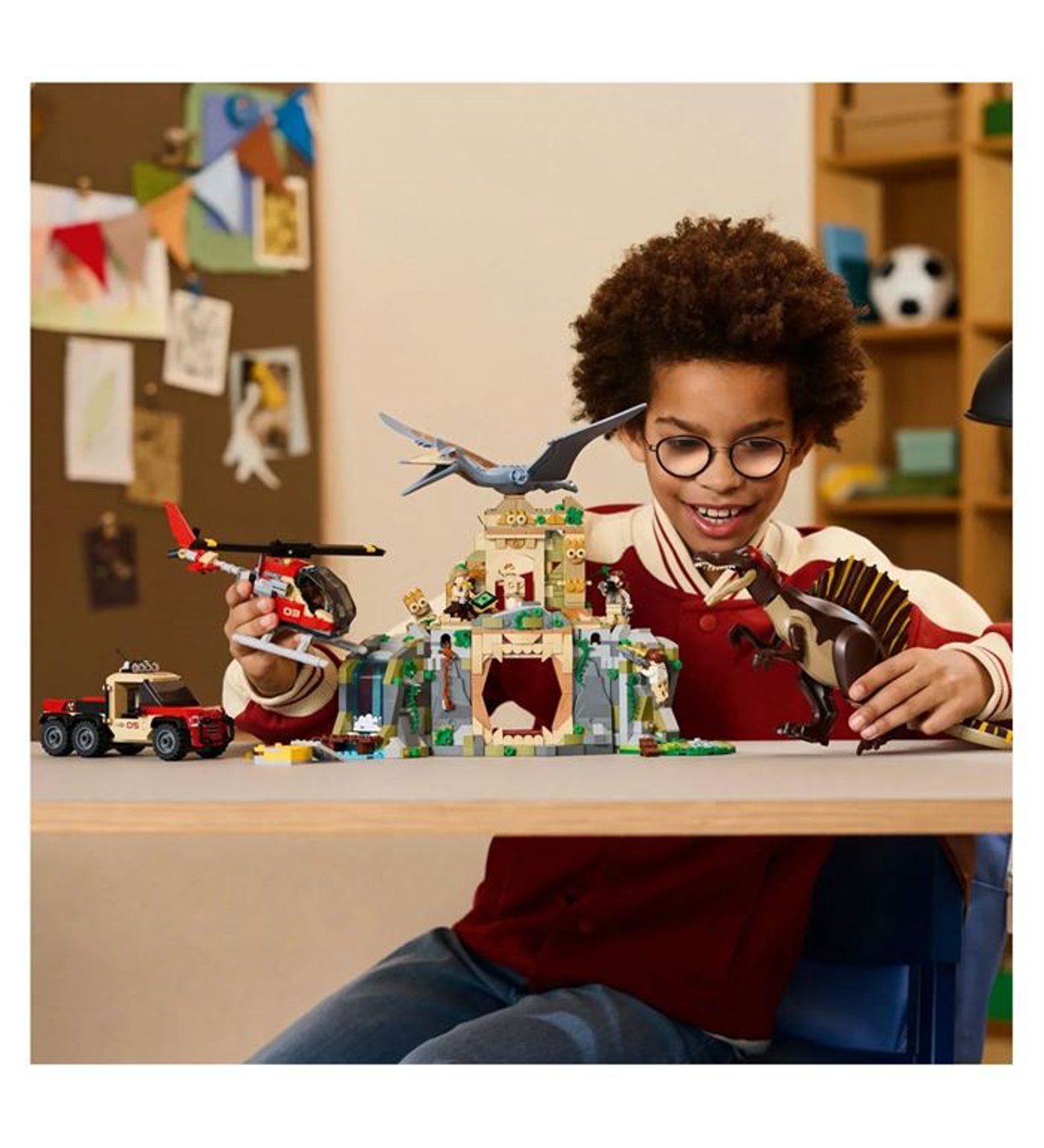 Kalıplı Spinosaurus ve Quetzalcoatlus figürleri, 4 film karakteri minifigürü, antik bir tapınak, oyuncak helikopter ve dinozor kamyonu oyuncağının yanı sıra birçok detay.