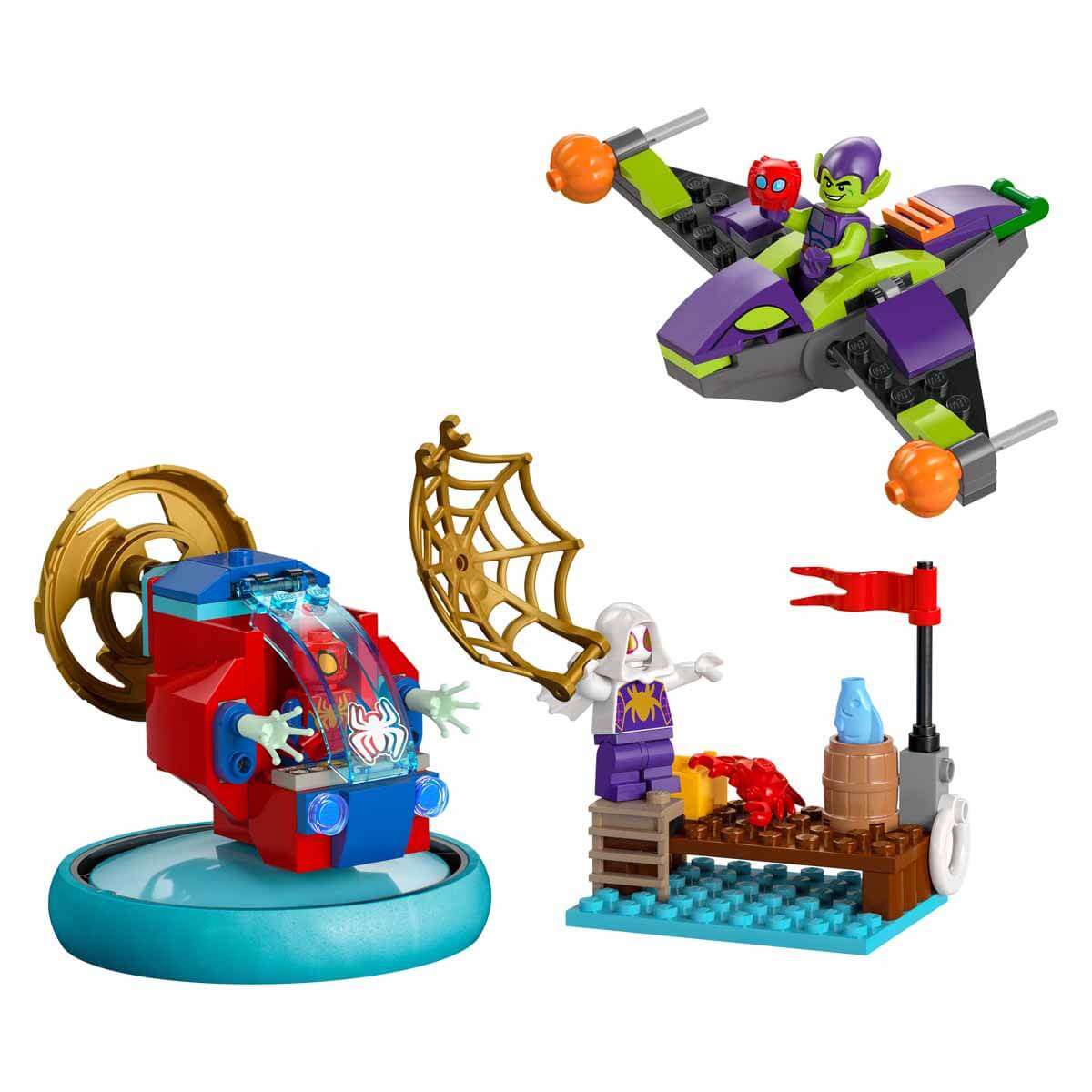 Bu Disney+ Spidey ve İnanılmaz Arkadaşları oyuncak araç setinde bir Spidey mini figürü ile dönen pervaneli ve açılan kokpitli uçan aracı; bir Green Goblin mini figürü ile bal kabağı füzeli planörü ve bir Ghost-Spider mini figürü ile büyük, altın ağ parçası bulunur.