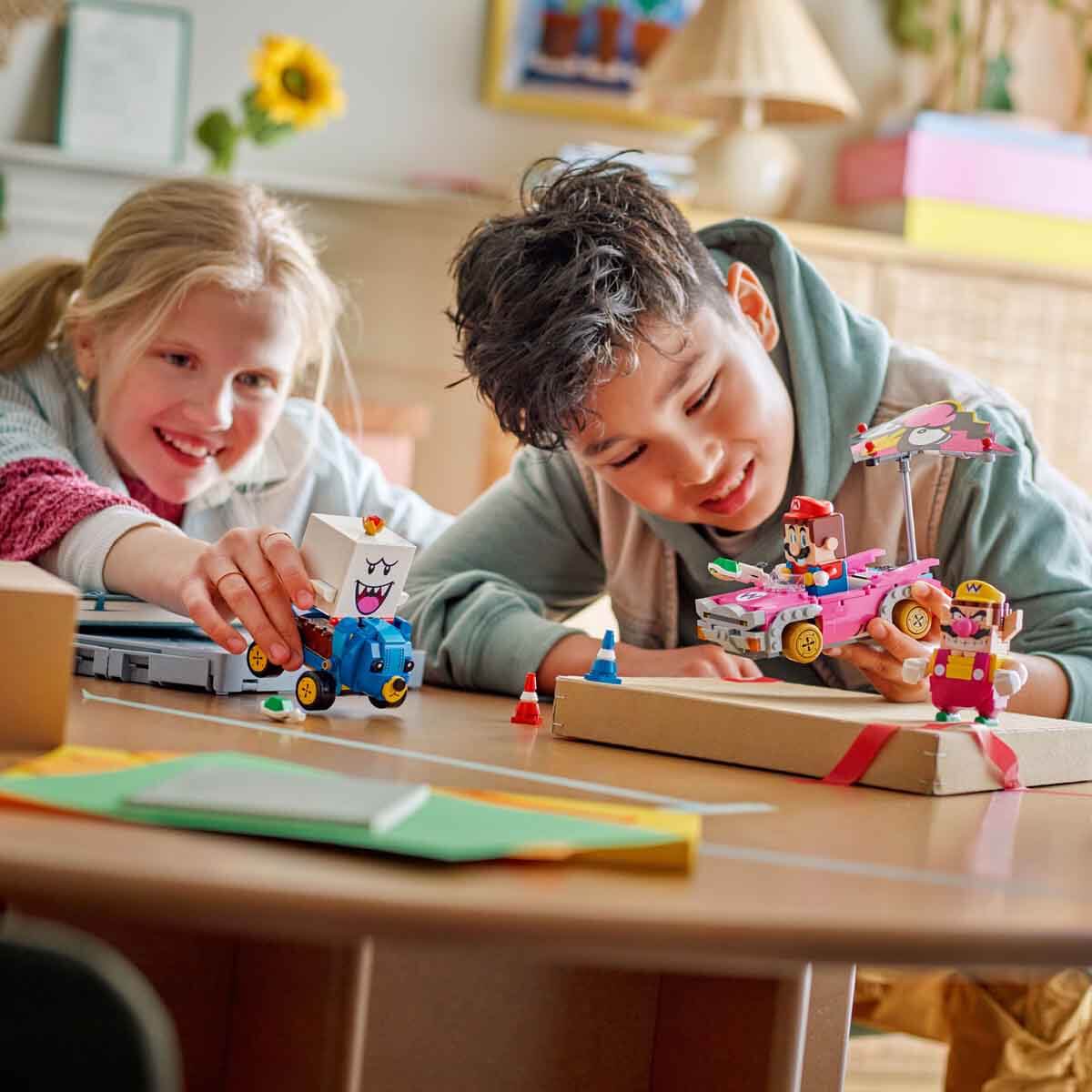 Parçalarla yapılan Mario Kart oyuncak yarışları: Badwagon'da Wario’ya ve Teddy Buggy'de King Boo’ya katılarak kabuk atmalı savaşlar yapın, drift ve süzülme eğlencesi yaşayın ve trafik konilerinin arasından yarışlar yapın!