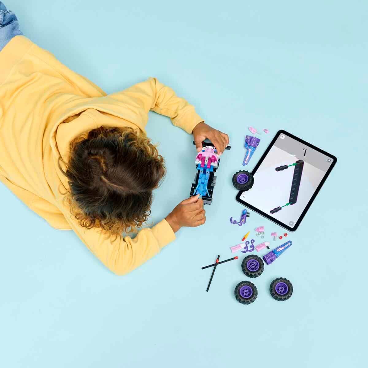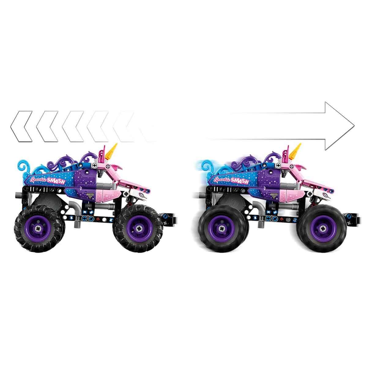 Monster Jam yapım oyuncağı; LEGO Technic Monster Jam Sparkle Smash Çek-Bırak (42220), canavar kamyonları ve tek boynuzlu at oyuncaklarını seven 7 yaş ve üzeri erkek ve kız çocuklara saatlerce oyun sunar.