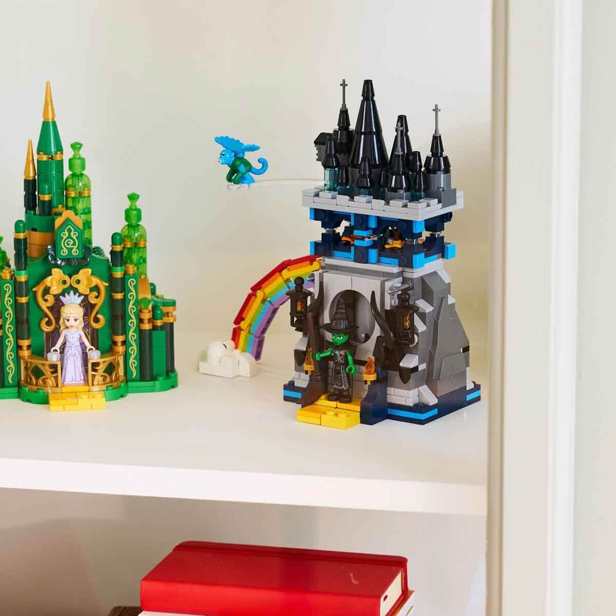 LEGO Wicked macera hediyesi! Emerald City ve Kiamo Ko Kalesi oyun setinde 2 yapım oyuncağı, LEGO Wicked Elphaba ve Glinda mini bebekleri, uçan maymun figürü ve inşa edilebilen bir gökkuşağı bulunur.