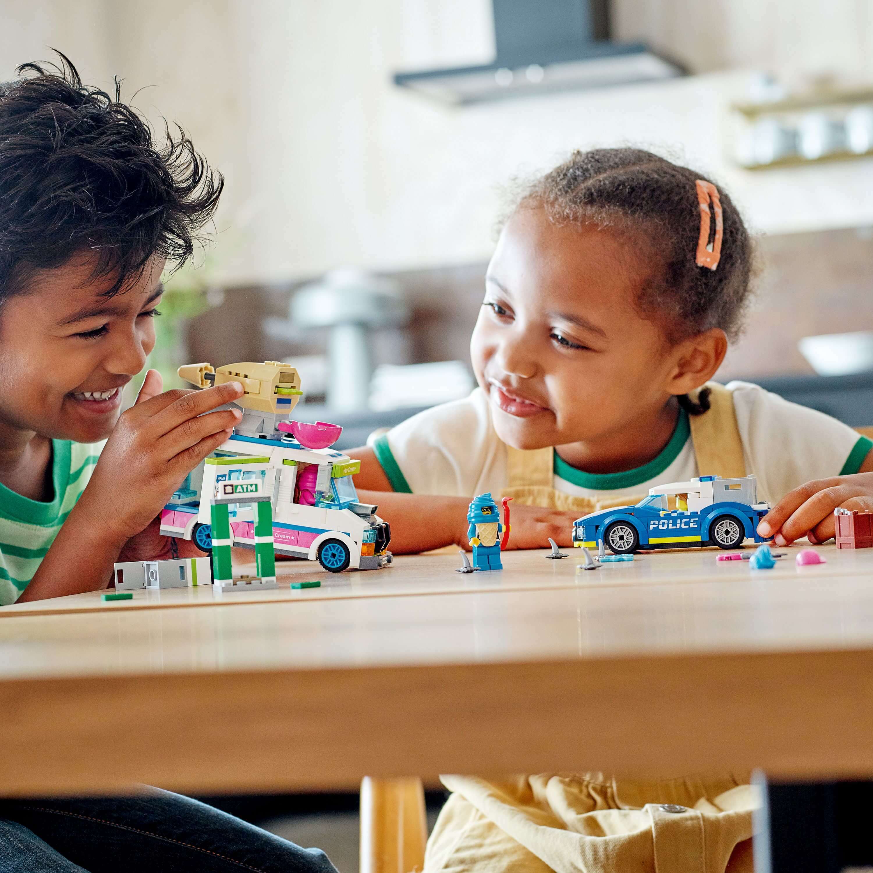Çocuklar, dondurma fırlatıcılı özel hırsız dondurma kamyonu, ayrıca lastik kesicili havalı bir polis müdahale aracı içeren bu LEGO® City Dondurma Kamyonu