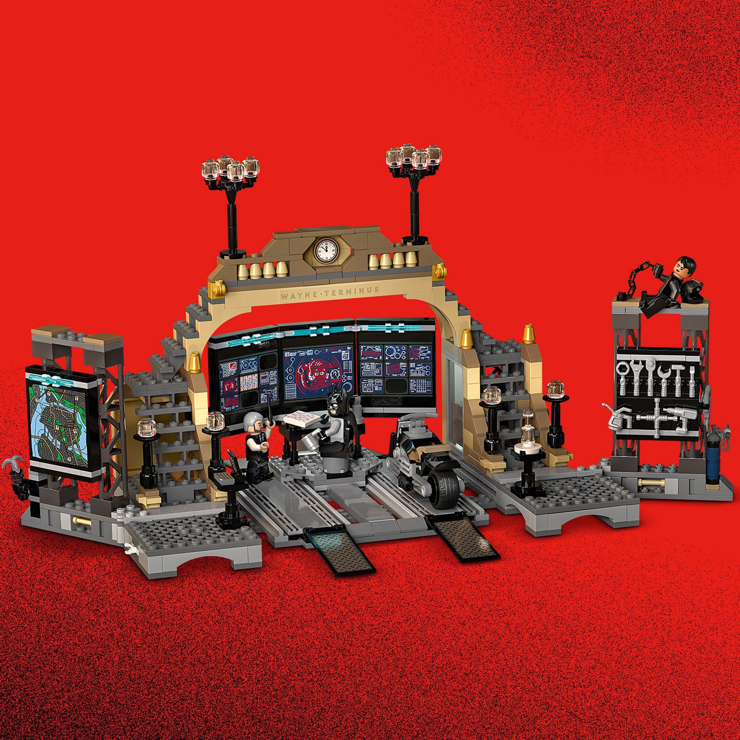 Batcave’de bilgisayarlar, aletler ve araç tamiri için kaynak makinesi var. Birinde büyük bir GOTHAM CITY haritası, diğerinde alet rafı olan 2 yan duvar
