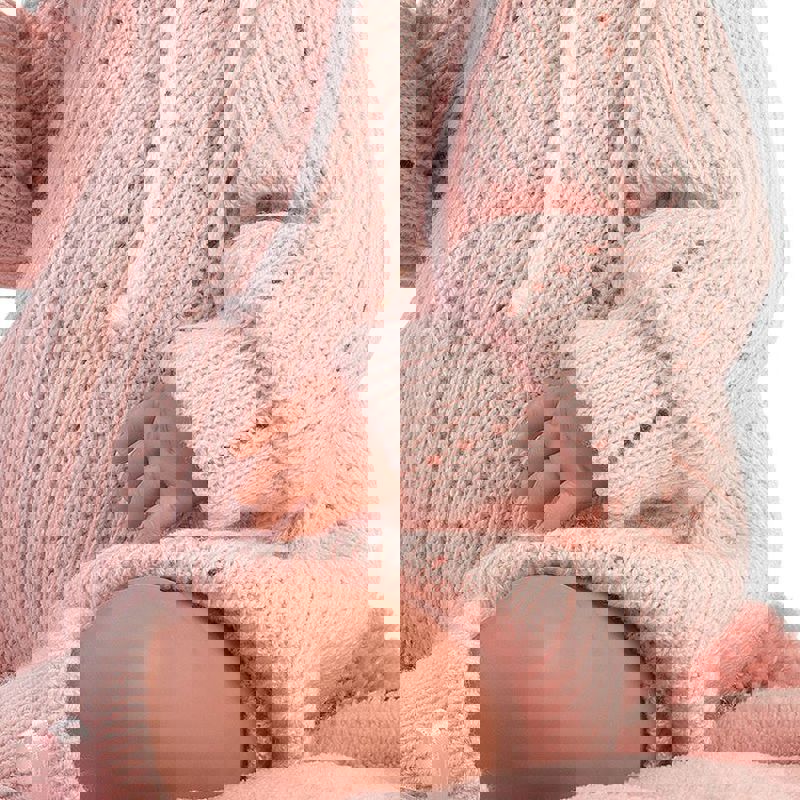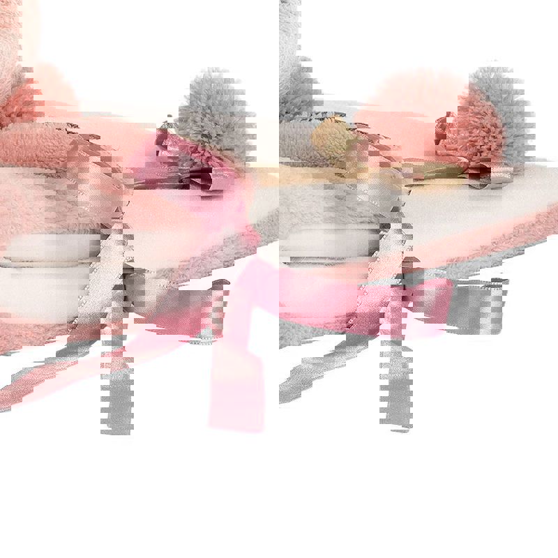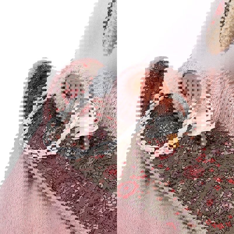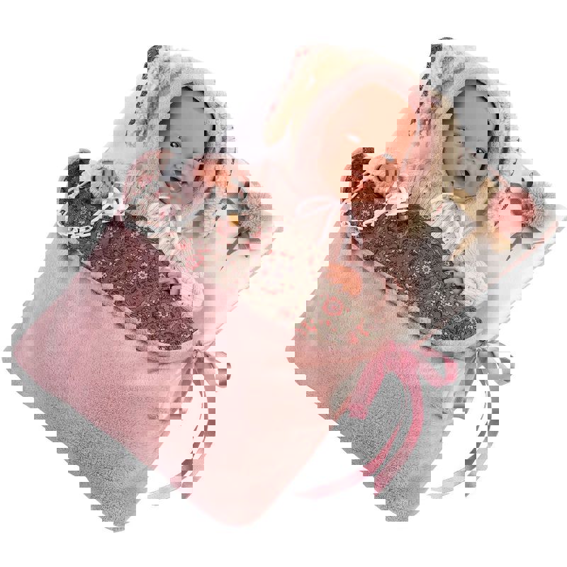 Set, çiçek desenli, ponponlu ve fiyonklu sıcak tutan bir uyku tulumu içerir.