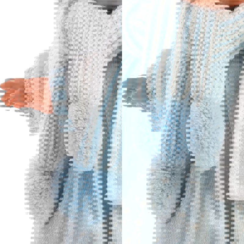 Şapka ile uyumlu ponponlu sıcak tutan yün atkı ve setin altında kalın çoraplar ile stil tamamlanıyor.