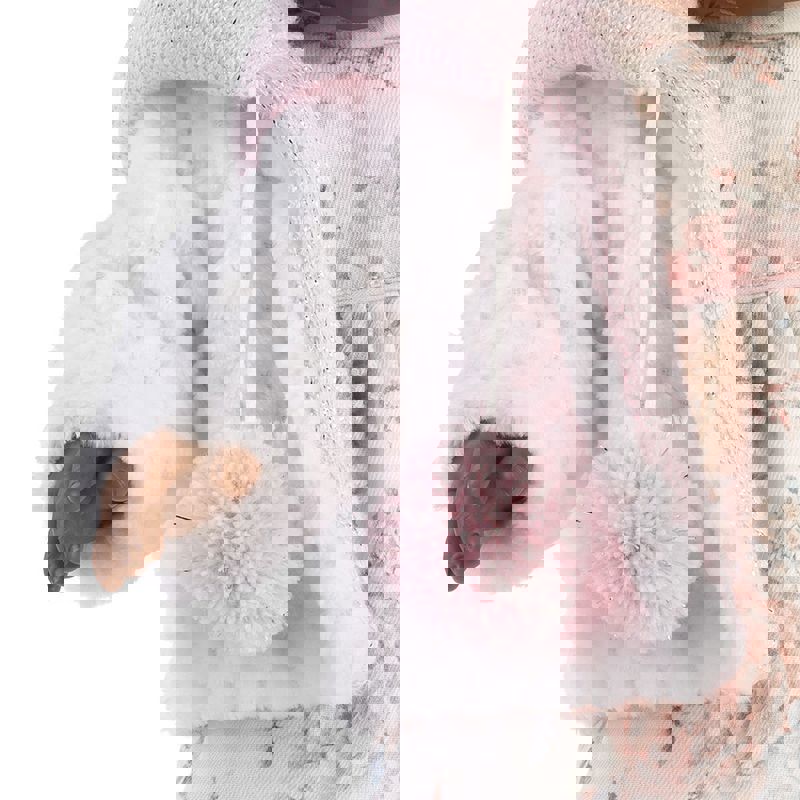 giymiş, pembe çiçekli, kürklü çoraplar, ve kapüşonlu ve ponponlu bir kürk