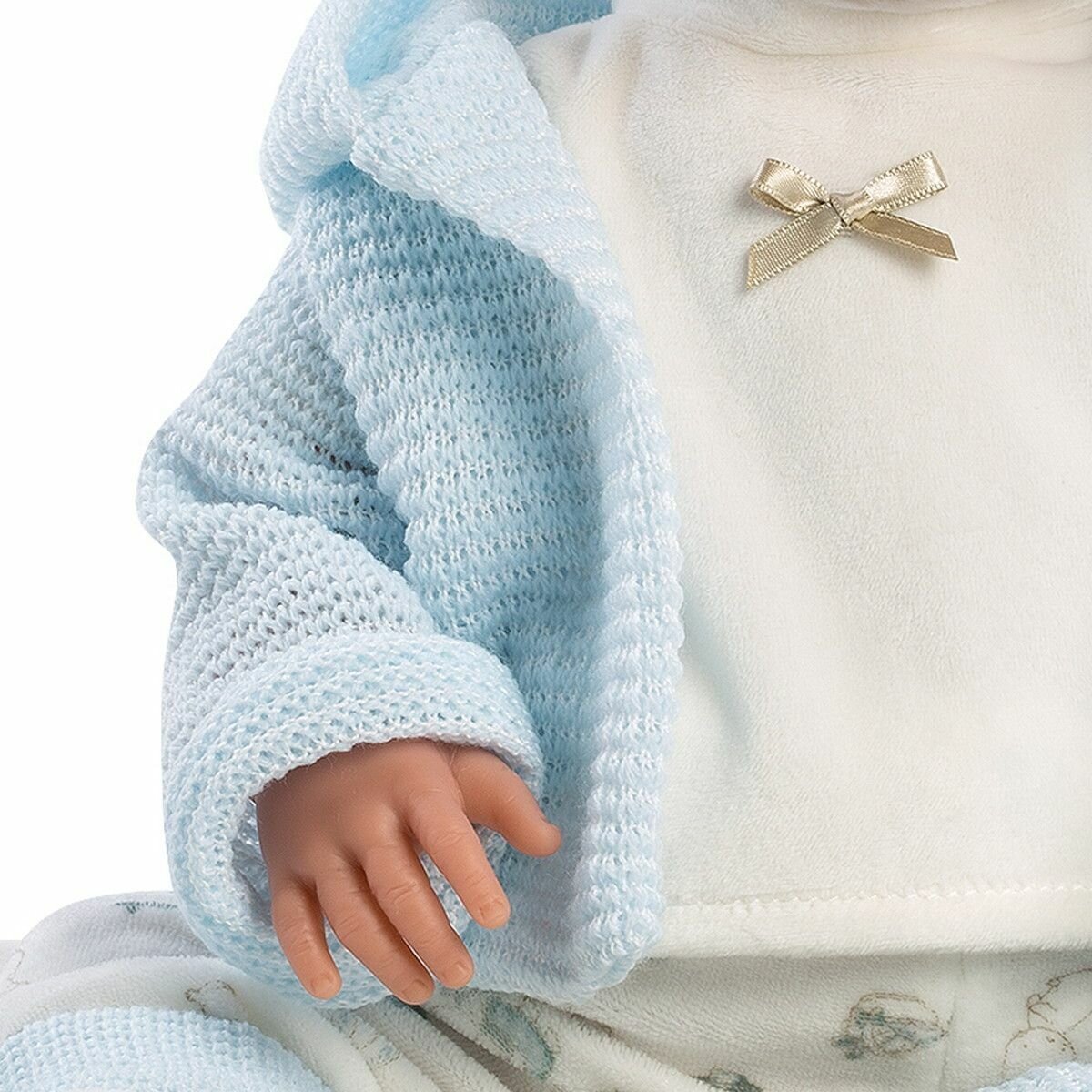 Oyuncak bebek beyaz bir bluz ve pantolon ile mavi bir bere ve eşofman üstü giyer.