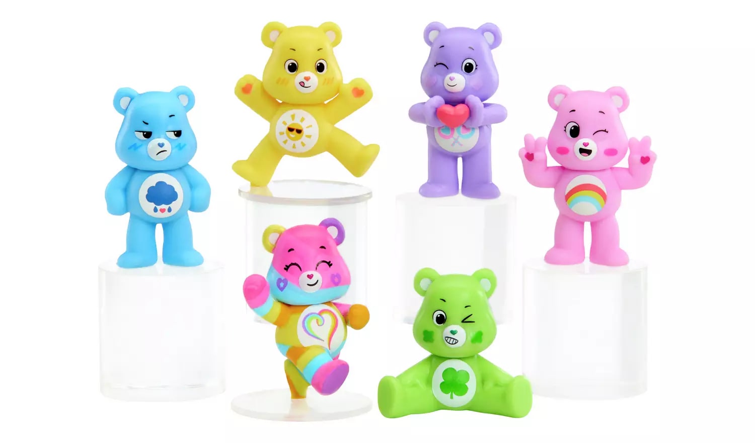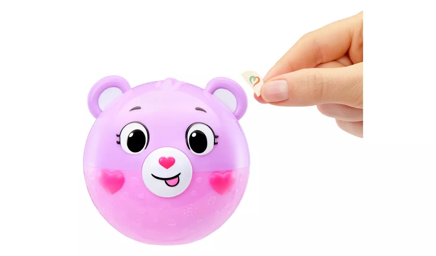 Her bir sevimli top, bir Care Bear'ın yüzü şeklinde tasarlanmıştır ve her sevimli karakteri temsil eden, kulağında kendine özgü bir çıkartma rozeti bulunur.