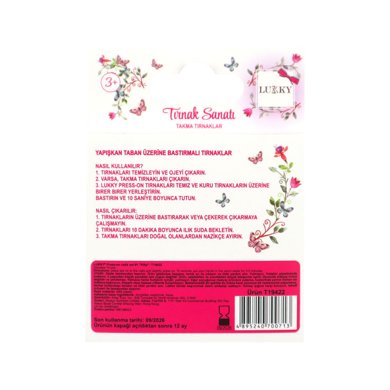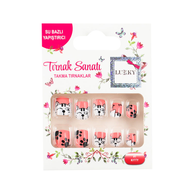 Lukky Kedi Baskılı Yapışkanlı Takma Tırnak Seti, parmak uçlarınıza eğlence ve lezzet patlamasıyla sevimli tırnak çıkartmaları getiriyor.