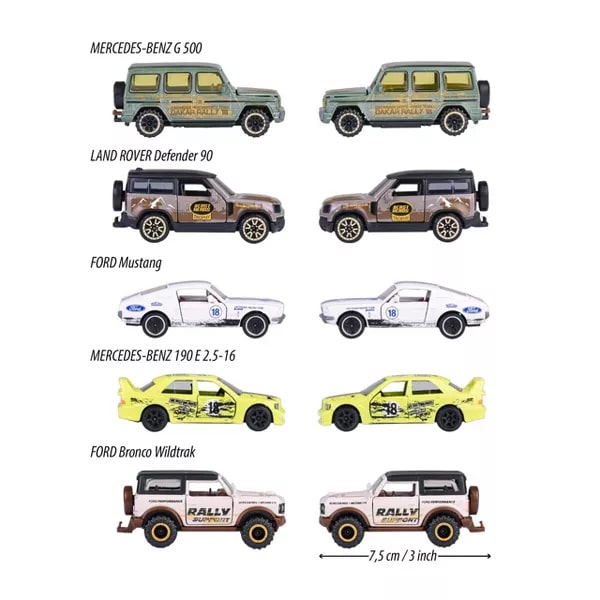 Majorette CastHeads Road Racer Diecast Araçlar Hediye Paketi ile yol yarışı heyecanını keşfedin. Bu set, beş ikonik ve yüksek kaliteli diecast model araba içerir: Mercedes Benz 190E 2.5-16, Mercedes Benz G 500, Ford Mustang Fastback, Ford Bronco Wildtrak ve Land Rover Defender 90, hepsi 1:64 ölçeğinde.