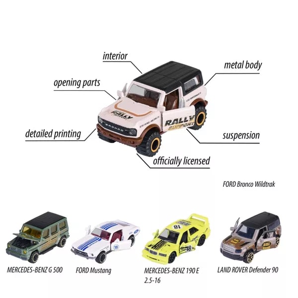 Her oyuncak araba, serbest tekerlek aksiyonu ve süspansiyonu sunar ve gerçekçi detaylar ve canlı tasarımlarla üretilmiştir, bu da onları yaratıcı oyun veya sergileme için mükemmel hale getirir.