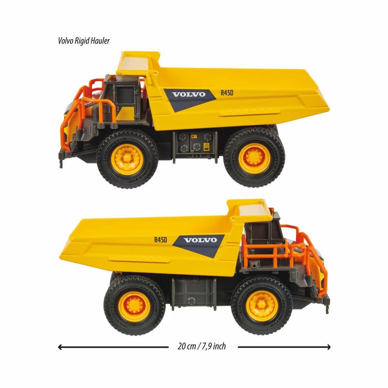 Lastik tekerlekli, ışık ve ses efektli ve açılan kaportalı 20 cm. büyüklüğünde Majorette Volvo damperli kamyon. Metal ve plastikten yapılmıştır.